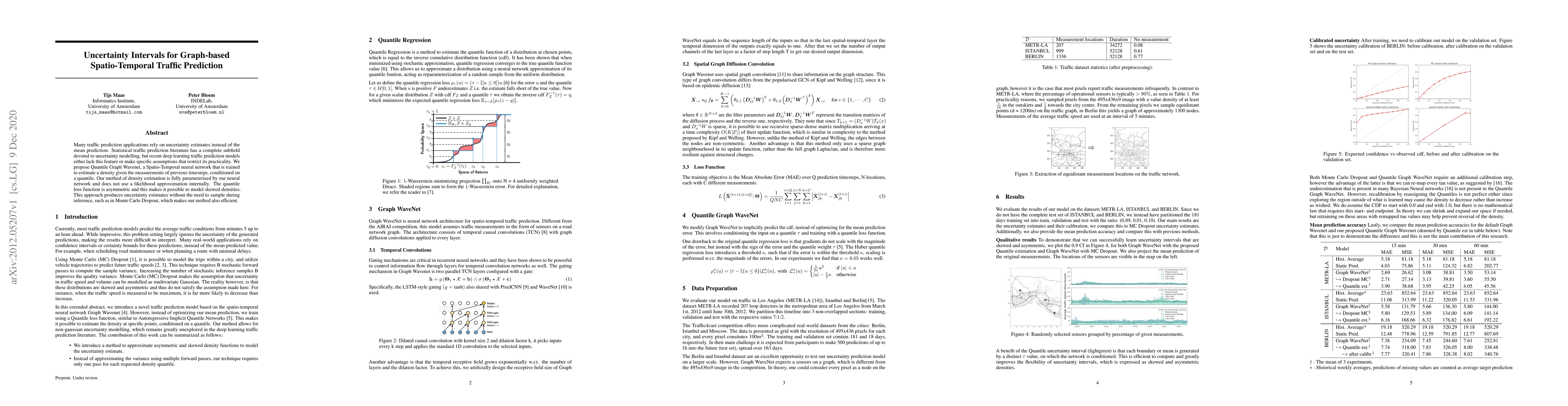 Researchers propose a new method for traffic prediction that estimates uncertainty intervals without sampling during inference, allowing for efficient density estimation and modeling of skewed densities. The Quantile Graph Wavenet approach produces reliable uncertainty estimates without relying on Monte Carlo methods.