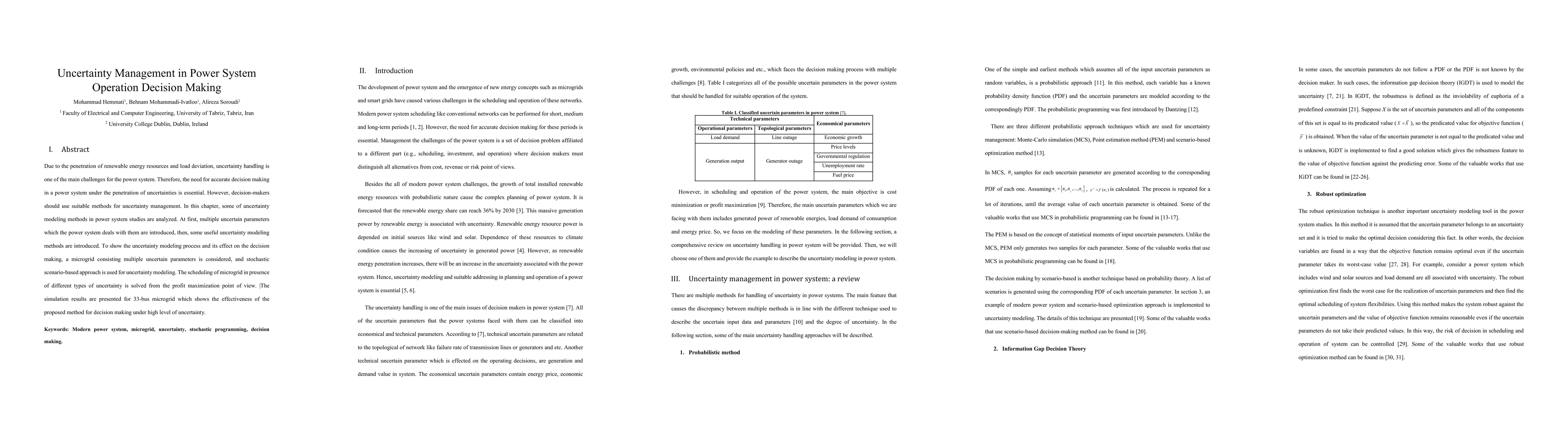 Due to the penetration of renewable energy resources and load deviation, uncertainty handling is one of the main challenges for power system; therefore the need for accurate decision-making in a power system under the penetration of uncertainties is essential. However, decision makers should use suitable methods for uncertainty management. In this chapter, some of the uncertainty modeling methods in power system studies are analyzed. At first, multiple uncertain parameters that the power system deals with are introduced, then some useful uncertainty modeling methods are introduced. To show the uncertainty modeling process and its effect on the decision-making, a microgrid consisting of multiple uncertain parameters is considered, and stochastic scenario-based approach is used for uncertainty modeling. The scheduling of microgrids in the presence of different types of uncertainty is solved from the profit-maximization point of view. The simulation results are presented for a 33-bus microgrid that shows the effectiveness of the proposed method for decision-making under high level of uncertainty.