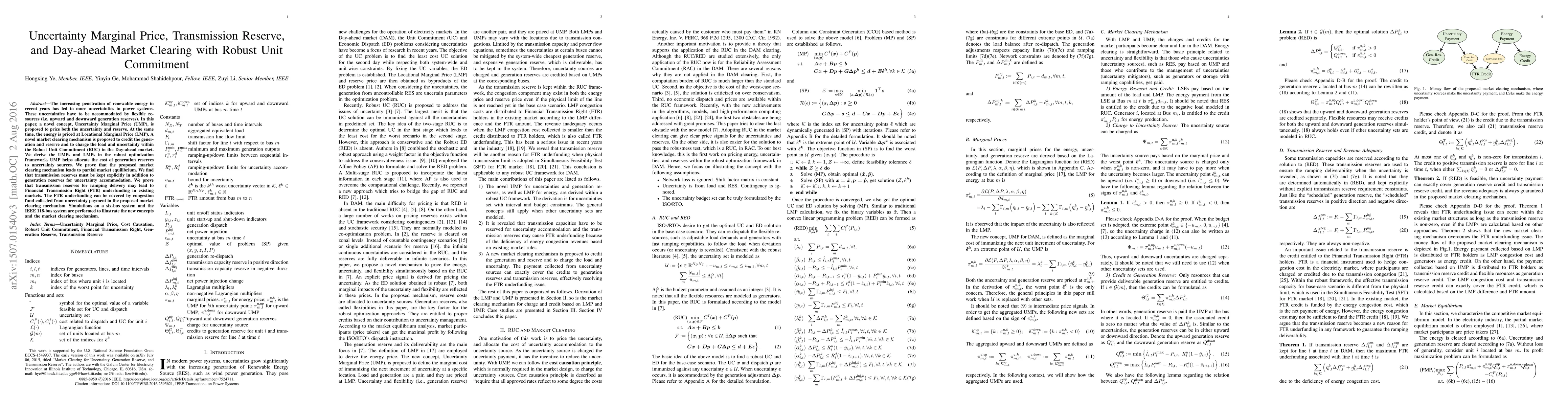 The increasing penetration of renewable energy in recent years has led to more uncertainties in power systems. These uncertainties have to be accommodated by flexible re- sources (i.e. upward and downward generation reserves). In this paper, a novel concept, Uncertainty Marginal Price (UMP), is proposed to price both the uncertainty and reserve. At the same time, the energy is priced at Locational Marginal Price (LMP). A novel market clearing mechanism is proposed to credit the gener- ation and reserve and to charge the load and uncertainty within the Robust Unit Commitment (RUC) in the Day-ahead market. We derive the UMPs and LMPs in the robust optimization framework. UMP helps allocate the cost of generation reserves to uncertainty sources. We prove that the proposed market clearing mechanism leads to partial market equilibrium. We find that transmission reserves must be kept explicitly in addition to generation reserves for uncertainty accommodation. We prove that transmission reserves for ramping delivery may lead to Financial Transmission Right (FTR) underfunding in existing markets. The FTR underfunding can be covered by congestion fund collected from uncertainty payment in the proposed market clearing mechanism. Simulations on a six-bus system and the IEEE 118-bus system are performed to illustrate the new concepts and the market clearing mechanism.