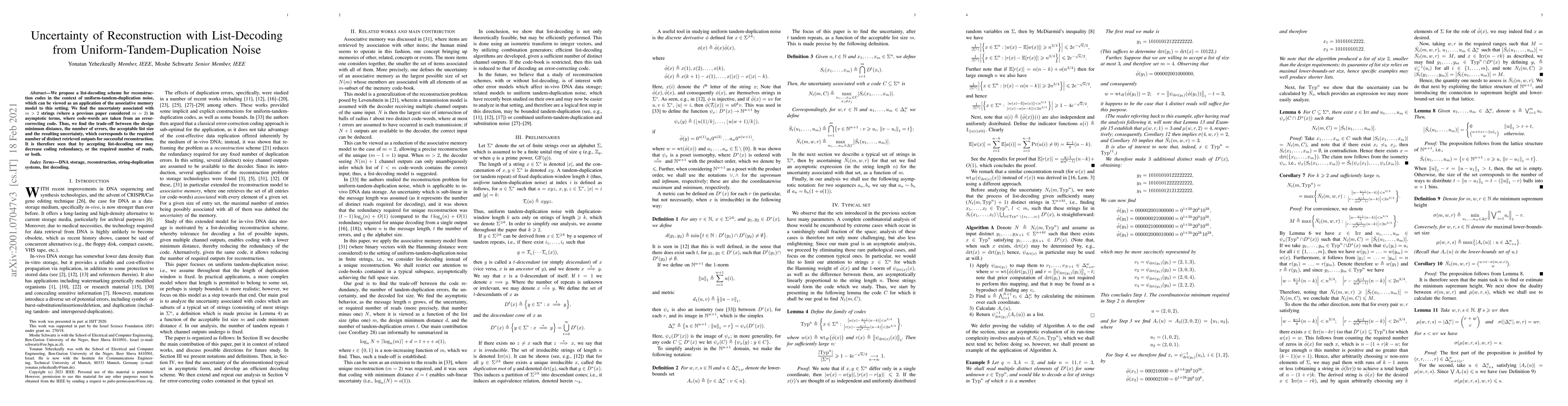 We propose a list-decoding scheme for reconstruction codes in the context of uniform-tandem-duplication noise, which can be viewed as an application of the associative memory model to this setting. We find the uncertainty associated with $m>2$ strings (where a previous paper considered $m=2$) in asymptotic terms, where code-words are taken from an error-correcting code. Thus, we find the trade-off between the design minimum distance, the number of errors, the acceptable list size and the resulting uncertainty, which corresponds to the required number of distinct retrieved outputs for successful reconstruction. It is therefore seen that by accepting list-decoding one may decrease coding redundancy, or the required number of reads, or both.