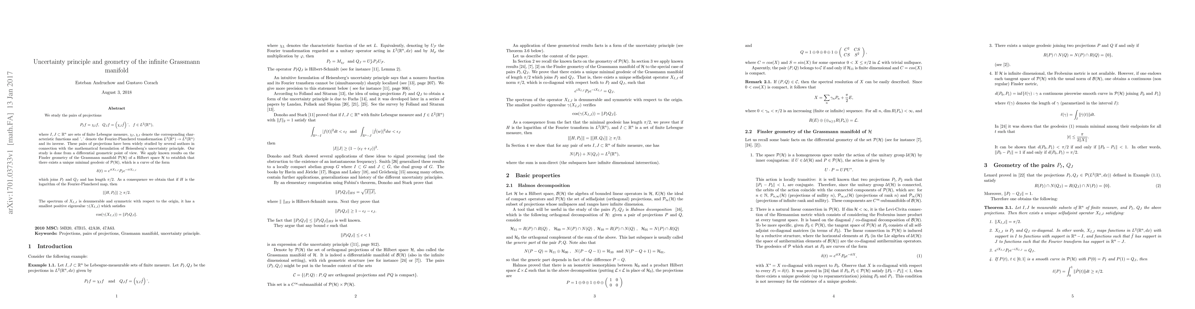 We study the pairs of projections $$ P_If=\chi_If ,\ \ Q_Jf= \left(\chi_J \hat{f}\right)\check{\ } , \ \ f\in L^2(\mathbb{R}^n), $$ where $I, J\subset \mathbb{R}^n$ are sets of finite Lebesgue measure, $\chi_I, \chi_J$ denote the corresponding characteristic functions and $\hat{\ } , \check{\ }$ denote the Fourier-Plancherel transformation $L^2(\mathbb{R}^n)\to L^2(\mathbb{R}^n)$ and its inverse. These pairs of projections have been widely studied by several authors in connection with the mathematical formulation of Heisenberg's uncertainty principle. Our study is done from a differential geometric point of view. We apply known results on the Finsler geometry of the Grassmann manifold ${\cal P}({\cal H})$ of a Hilbert space ${\cal H}$ to establish that there exists a unique minimal geodesic of ${\cal P}({\cal H})$, which is a curve of the form $$ \delta(t)=e^{itX_{I,J}}P_Ie^{-itX_{I,J}} $$ which joins $P_I$ and $Q_J$ and has length $\pi/2$. As a consequence we obtain that if $H$ is the logarithm of the Fourier-Plancherel map, then $$ \|[H,P_I]\|\ge \pi/2. $$ The spectrum of $X_{I,J}$ is denumerable and symmetric with respect to the origin, it has a smallest positive eigenvalue $\gamma(X_{I,J})$ which satisfies $$ \cos(\gamma(X_{I,J}))=\|P_IQ_J\|. $$