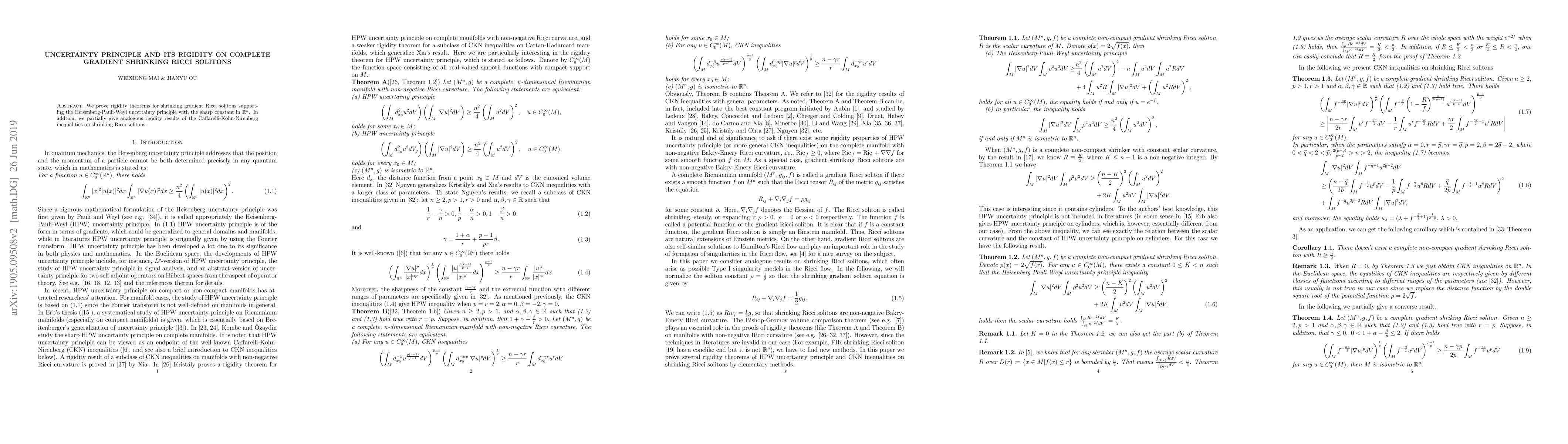 This paper proves rigidity theorems for shrinking gradient Ricci solitons that satisfy the Heisenberg-Pauli-Weyl uncertainty principle with the optimal constant in $\mathbb{R}^n$, and also provides partial results for analogous Caffarelli-Kohn-Nirenberg inequalities on such solitons.