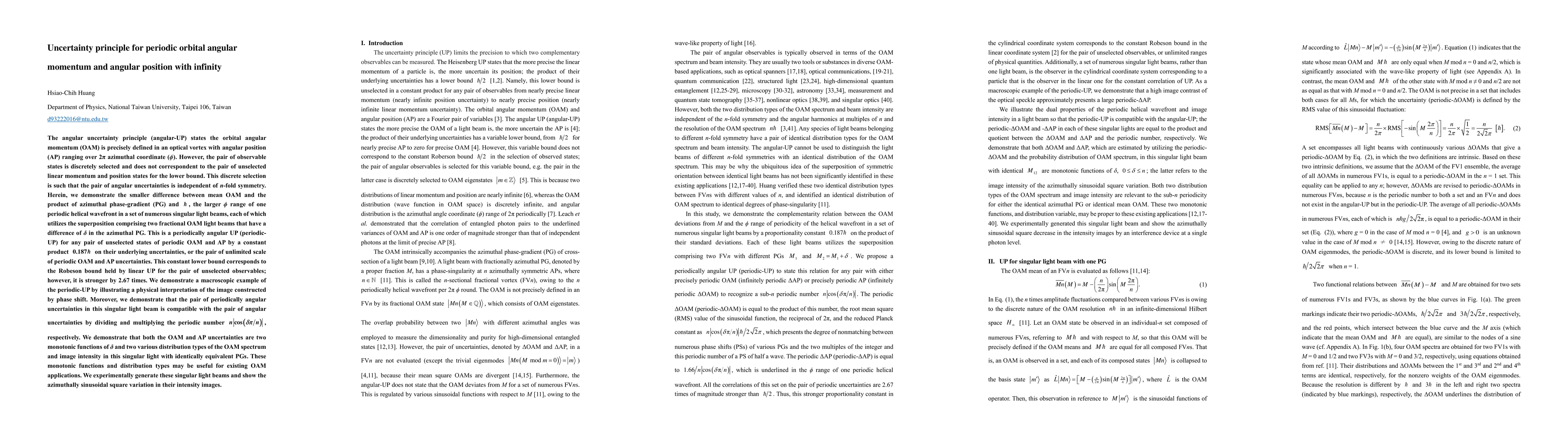 This paper proposes a periodic angular uncertainty principle (periodic-UP) for periodic orbital angular momentum (OAM) and angular position (AP), showing that the uncertainties of these observables are bounded by a constant factor of 0.187 h/2π, which is stronger by 2.67 times than the Robeson bound. The study experimentally generates singular light beams to demonstrate this principle.