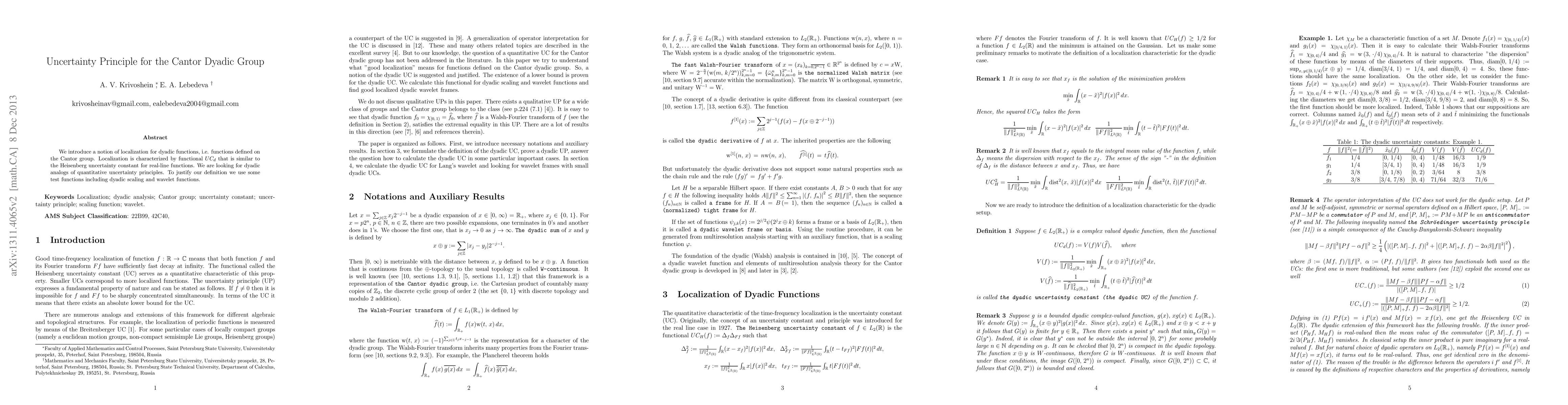 This paper introduces a localization concept for dyadic functions on the Cantor dyadic group and proposes a functional $UC_d$ analogous to the Heisenberg uncertainty principle for real-line functions, aiming to develop dyadic analogs of quantitative uncertainty principles, supported by dyadic scaling and wavelet test functions.