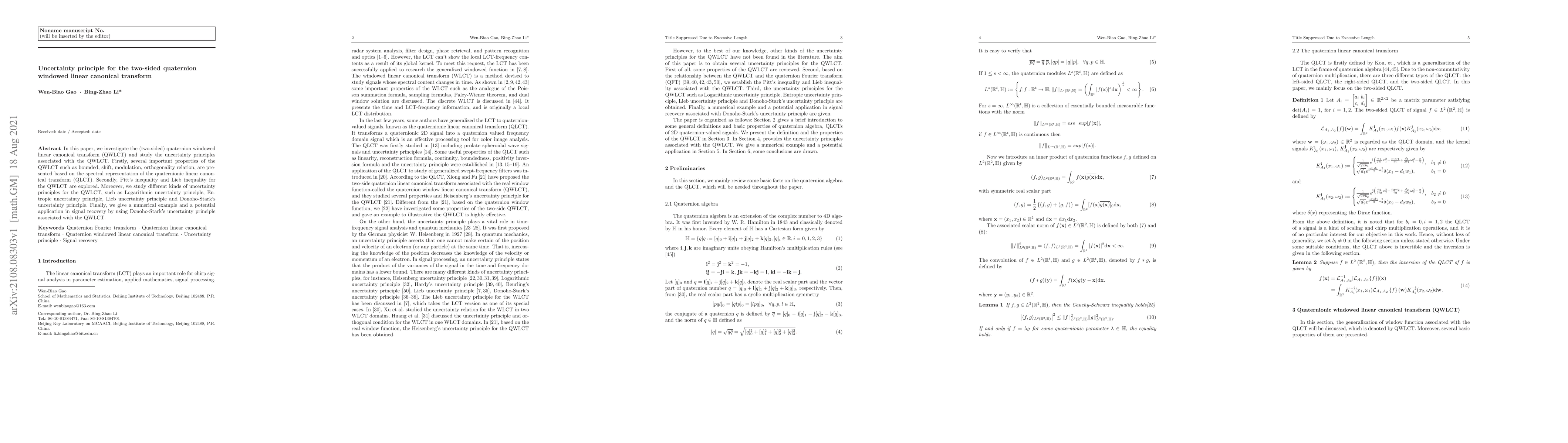 This paper explores the properties and uncertainty principles of the two-sided quaternion windowed linear canonical transform (QWLCT), including its bounded, shift, and modulation properties. It investigates various uncertainty principles like Pitt's and Lieb inequalities, and applies Donoho-Stark's principle for signal recovery.