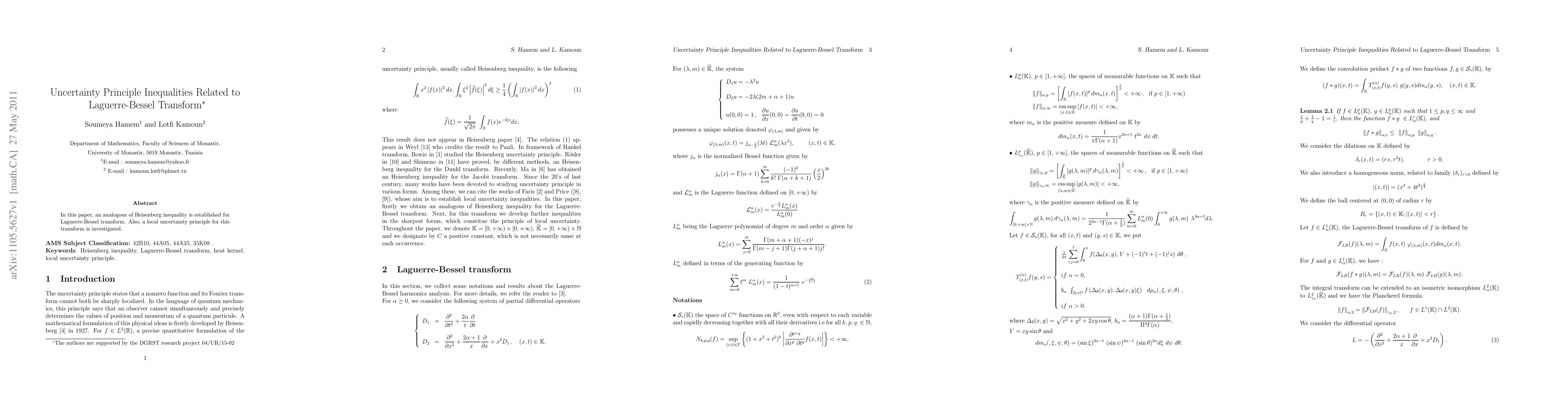 In this paper, an analogous of Heisenberg inequality is established for Laguerre-Bessel transform. Also, a local uncertainty principle for this transform is investigate
