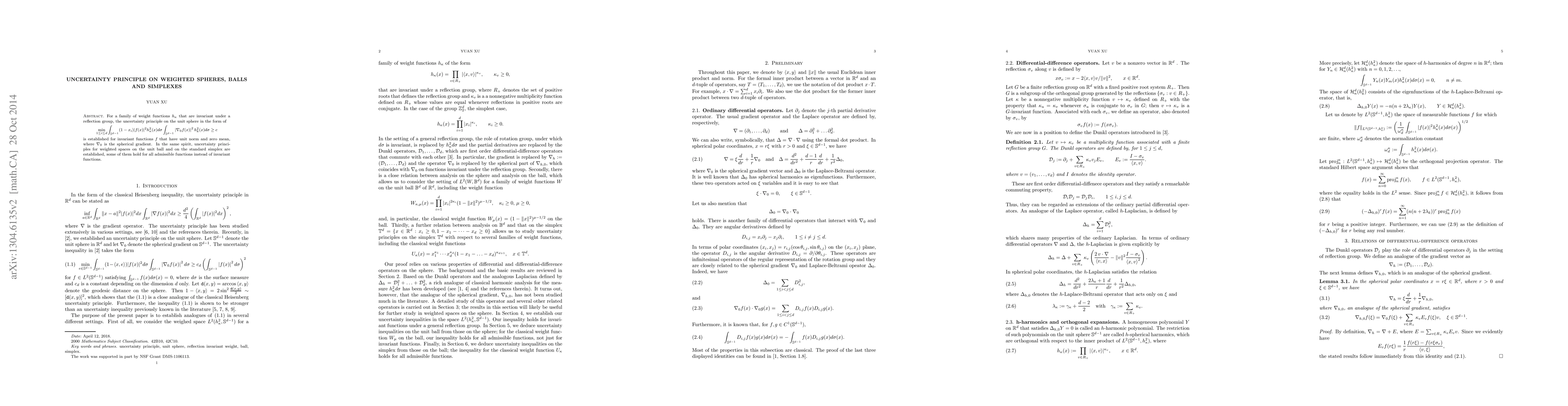 This paper establishes uncertainty principles for weighted spheres, balls, and simplexes using invariant weight functions under reflection groups. It proves a specific inequality for functions on the unit sphere, extending similar principles to weighted spaces on the unit ball and the standard simplex, with some results applicable to all admissible functions.