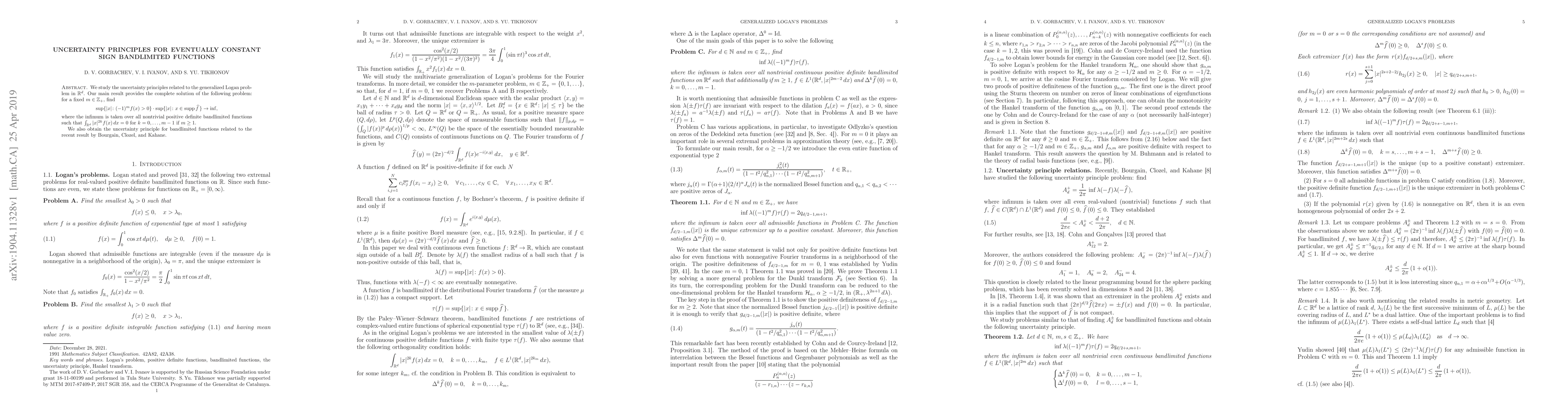 We study the uncertainty principles related to the generalized Logan problem in $\mathbb{R}^{d}$. Our main result provides the complete solution of the following problem: for a fixed $m\in \mathbb{Z}_{+}$, find \[ \sup\{|x|\colon (-1)^{m}f(x)>0\}\cdot \sup \{|x|\colon x\in \mathrm{supp}\,\widehat{f}\,\}\to \inf, \] where the infimum is taken over all nontrivial positive definite bandlimited functions such that $\int_{\mathbb{R}^d}|x|^{2k}f(x)\,dx=0$ for $k=0,\dots,m-1$ if $m\ge 1$. We also obtain the uncertainty principle for bandlimited functions related to the recent result by Bourgain, Clozel, and Kahane.