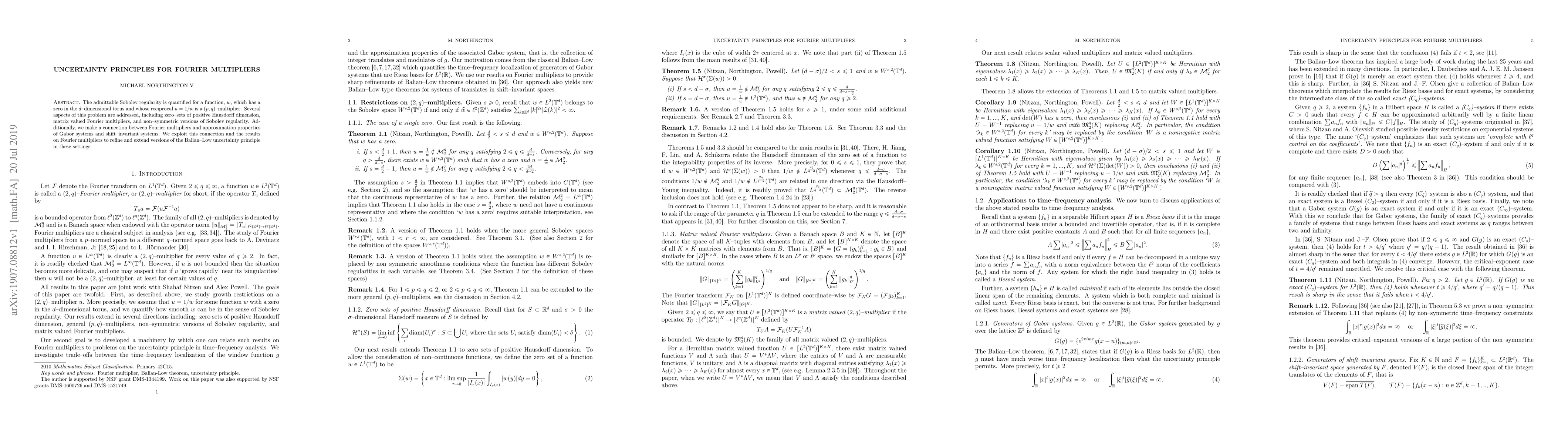 The admittable Sobolev regularity is quantified for a function, $w$, which has a zero in the $d$--dimensional torus and whose reciprocal $u=1/w$ is a $(p,q)$--multiplier. Several aspects of this problem are addressed, including zero--sets of positive Hausdorff dimension, matrix valued Fourier multipliers, and non--symmetric versions of Sobolev regularity. Additionally, we make a connection between Fourier multipliers and approximation properties of Gabor systems and shift--invariant systems. We exploit this connection and the results on Fourier multipliers to refine and extend versions of the Balian--Low uncertainty principle in these settings.
