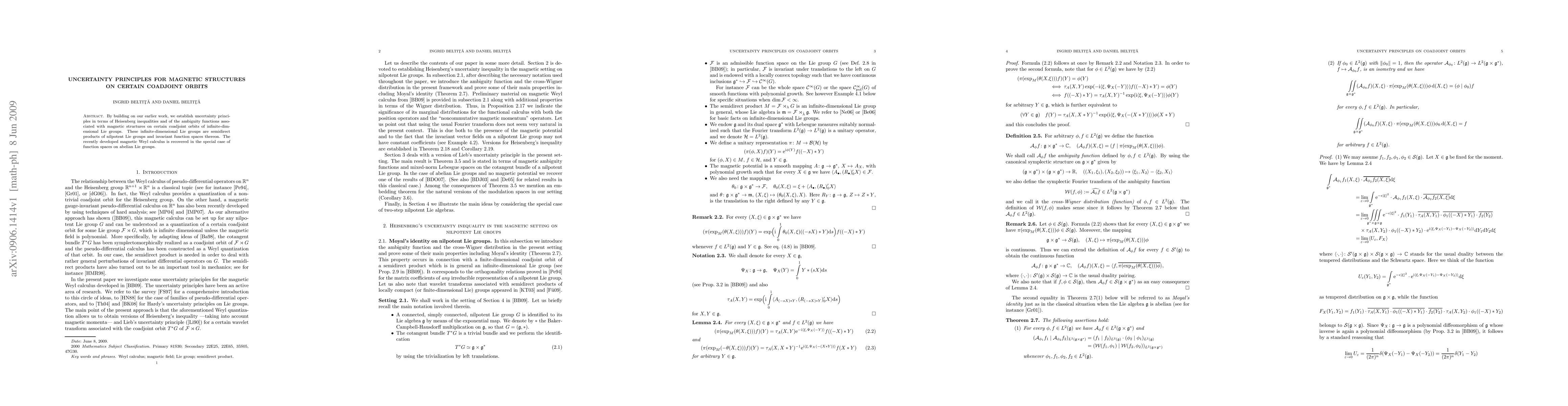 This paper establishes uncertainty principles, in terms of Heisenberg inequalities and ambiguity functions, for magnetic structures on specific coadjoint orbits of infinite-dimensional Lie groups, which are semidirect products of nilpotent Lie groups and invariant function spaces, with the magnetic Weyl calculus applying to abelian Lie groups.