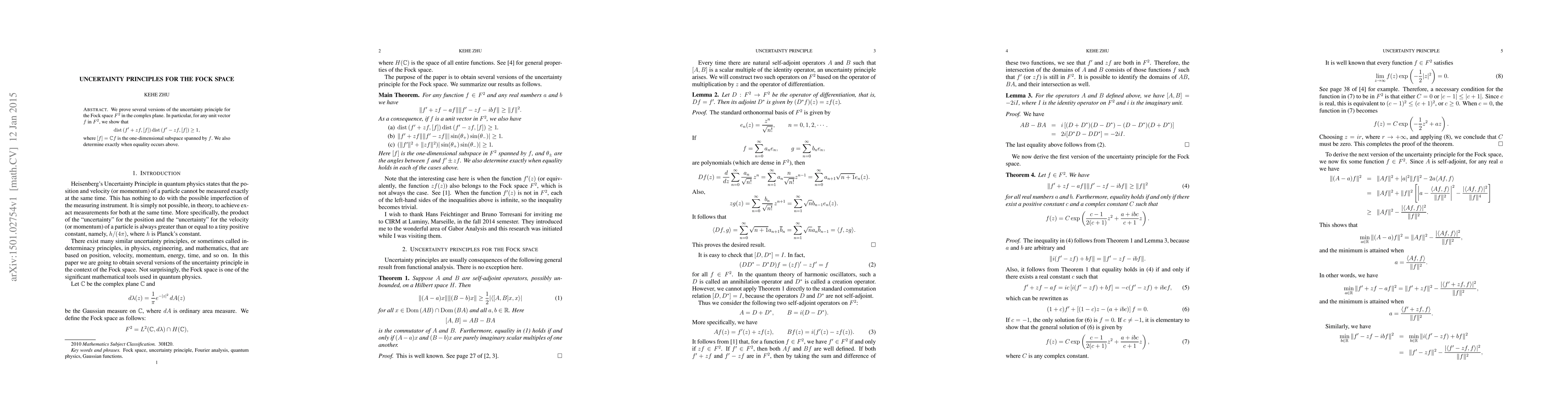 The paper presents proofs of various uncertainty principles applied to the Fock space, a mathematical construct in quantum mechanics, which could enhance understanding of quantum systems' inherent limitations in simultaneously measuring certain complementary properties.