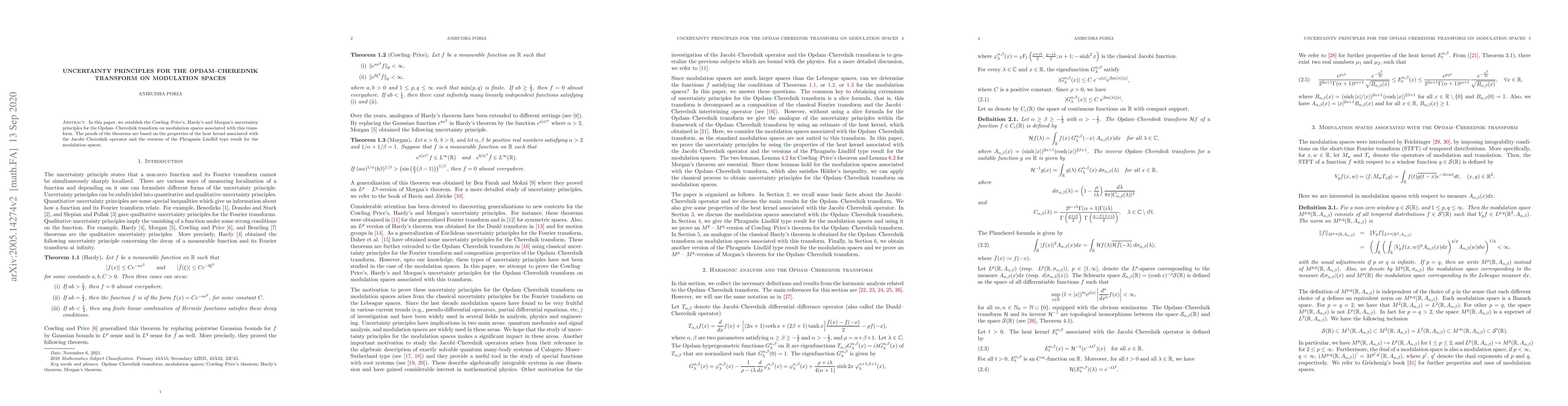 This paper establishes Cowling--Price's, Hardy's, and Morgan's uncertainty principles for the Opdam-Cherednik transform on modulation spaces, utilizing properties of the Jacobi-Cherednik operator's heat kernel and Phragmén-Lindlöf results for modulation spaces.