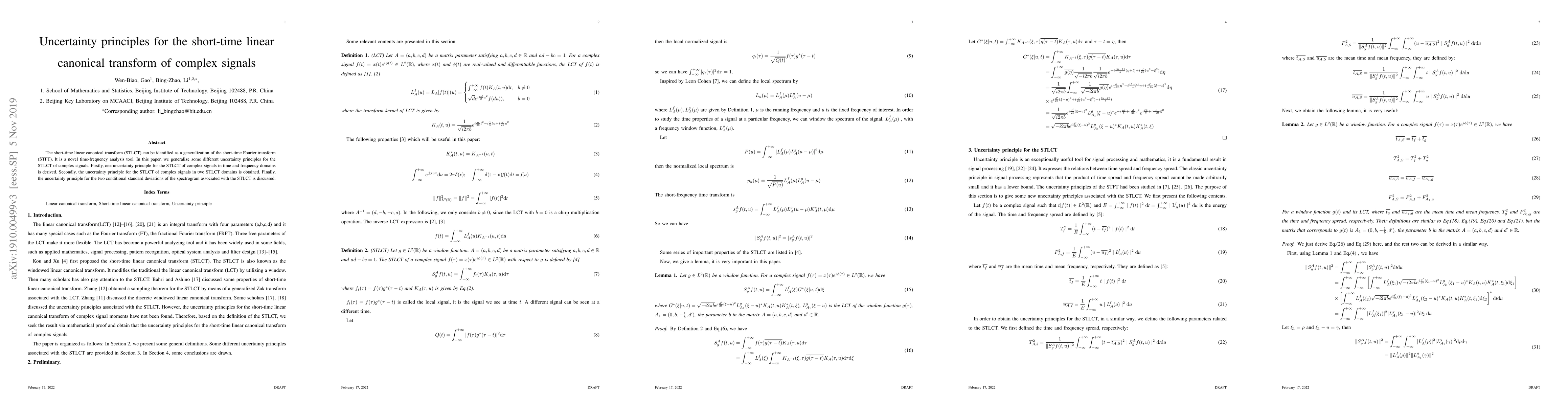 This paper generalizes uncertainty principles for the short-time linear canonical transform (STLCT) of complex signals, deriving principles in both time-frequency domains and two STLCT domains. It also discusses the uncertainty principle for the conditional standard deviations of the STLCT spectrogram.