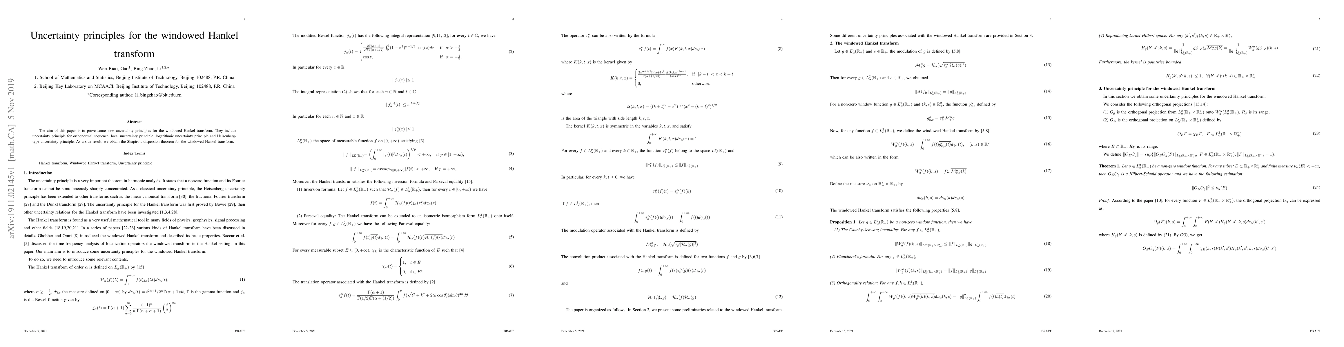 This paper establishes new uncertainty principles for the windowed Hankel transform, including orthonormal sequence, local, logarithmic, and Heisenberg-type uncertainty principles, and as a side result, derives Shapiro's dispersion theorem for the same transform.