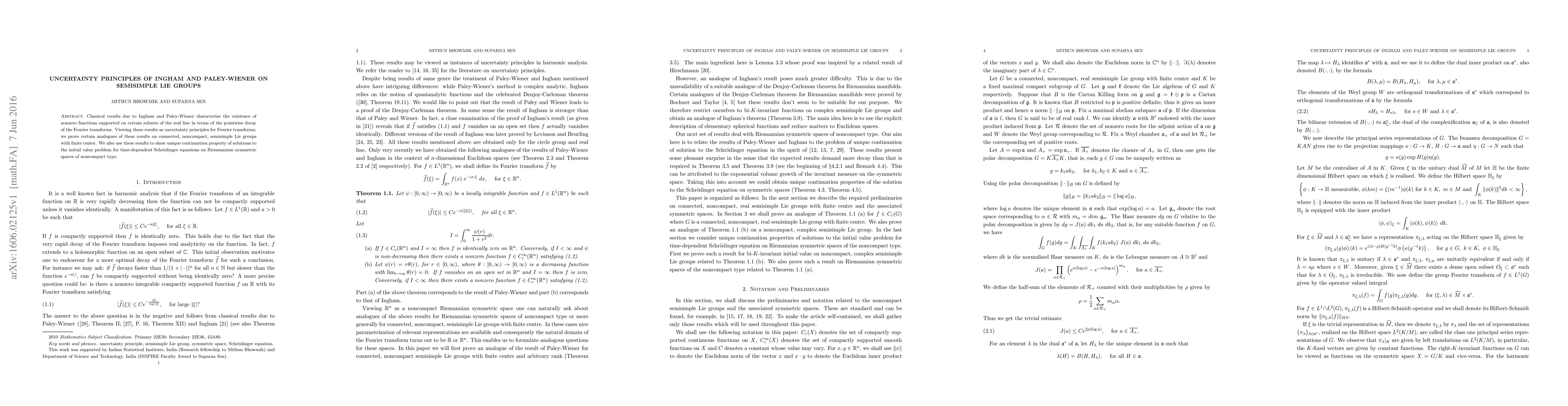 This paper extends classical Ingham and Paley-Wiener uncertainty principles to connected, noncompact, semisimple Lie groups, demonstrating their unique continuation properties for solutions to time-dependent Schrödinger equations on Riemannian symmetric spaces of noncompact type.
