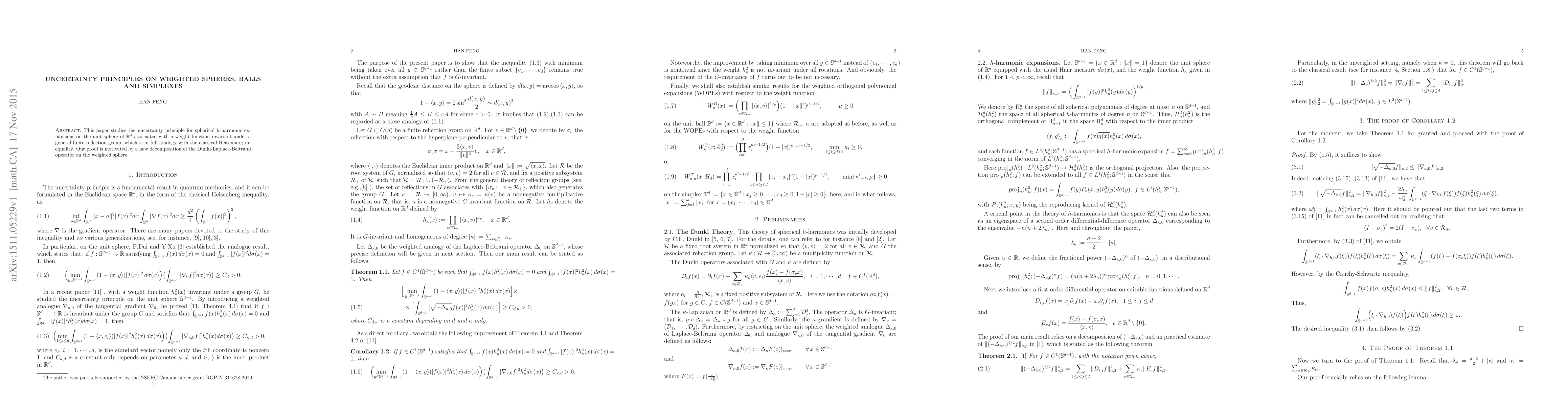 This paper studies the uncertainty principle for spherical $h$-harmonic expansions on the unit sphere of $\mathbb{R}^d$ associated with a weight function invariant under a general finite reflection group, which is in full analogy with the classical Heisenberg inequality. Our proof is motivated by a new decomposition of the Dunkl-Laplace-Beltrami operator on the weighted sphere.