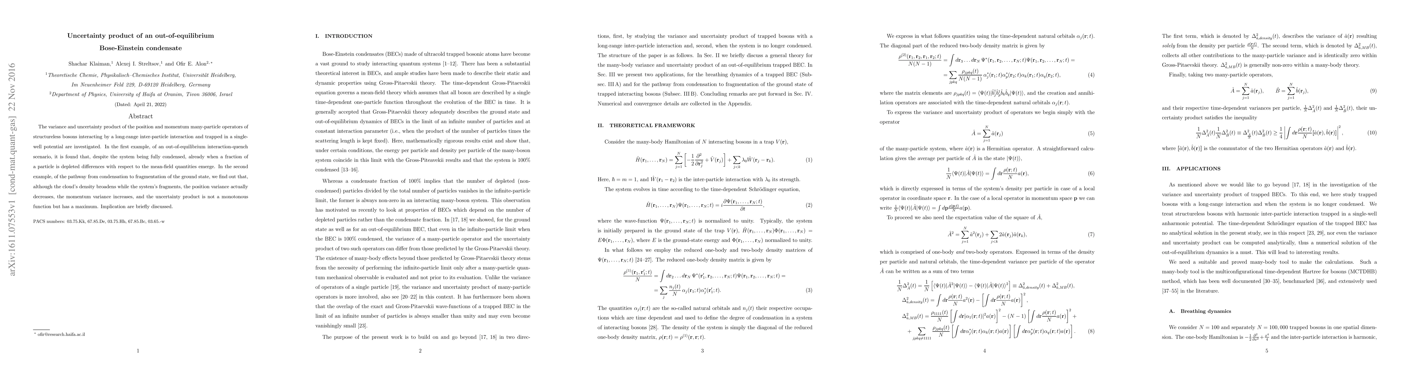 The variance and uncertainty product of the position and momentum many-particle operators of structureless bosons interacting by a long-range inter-particle interaction and trapped in a single-well potential are investigated. In the first example, of an out-of-equilibrium interaction-quench scenario, it is found that, despite the system being fully condensed, already when a fraction of a particle is depleted differences with respect to the mean-field quantities emerge. In the second example, of the pathway from condensation to fragmentation of the ground state, we find out that, although the cloud's density broadens while the system's fragments, the position variance actually decreases, the momentum variance increases, and the uncertainty product is not a monotonous function but has a maximum. Implication are briefly discussed.