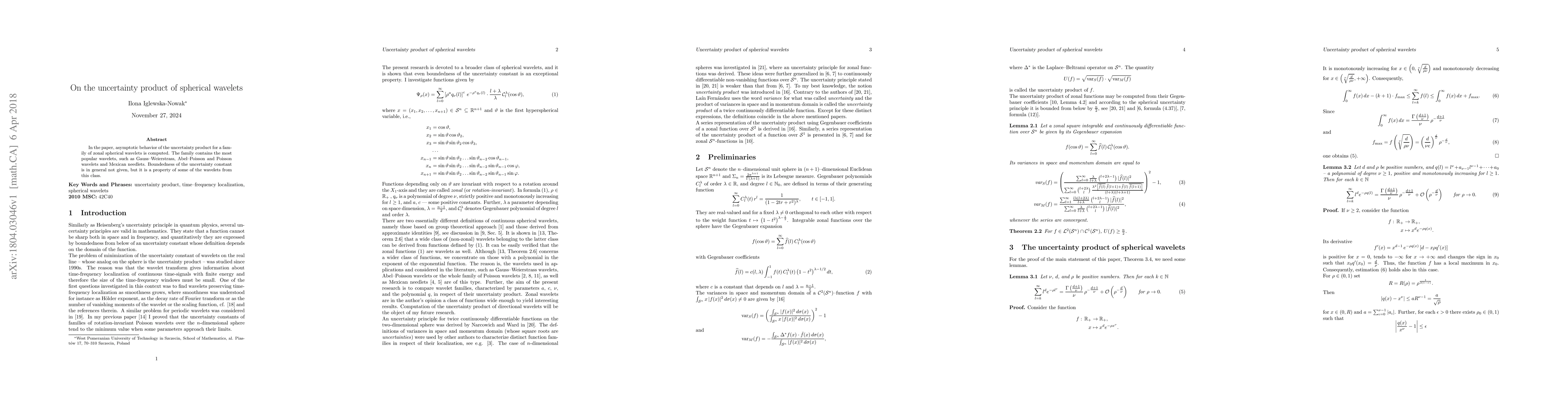 This paper calculates the asymptotic behavior of the uncertainty product for a family of spherical wavelets, including well-known variants like Gauss-Weierstrass and Mexican needlets, to determine their boundedness and properties.