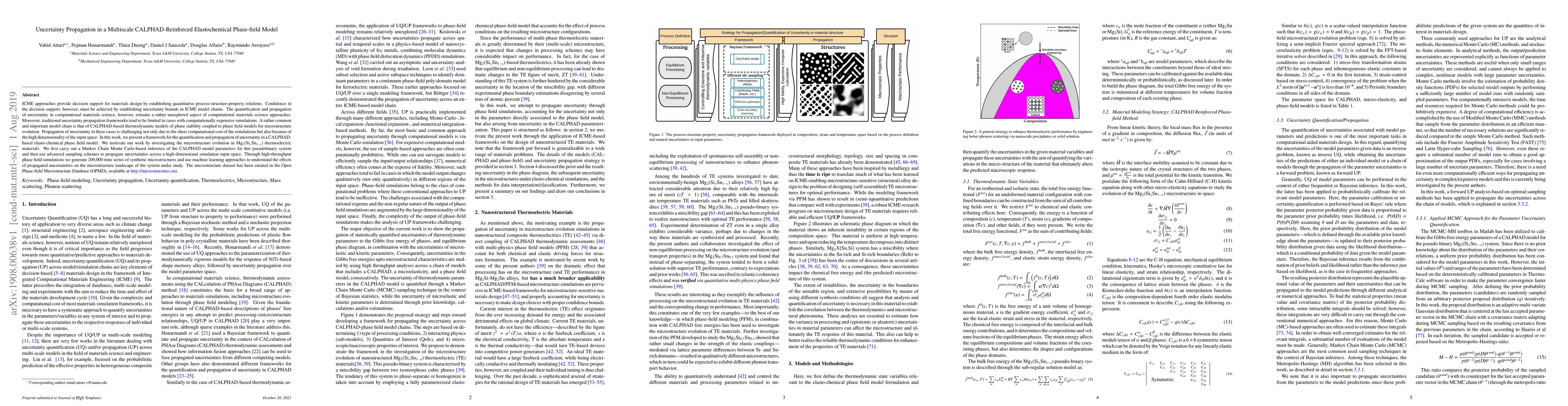 This paper proposes a framework for quantifying and propagating uncertainty in a multiscale CALPHAD-reinforced elastochemical phase-field model, focusing on Mg$_2$(Si$_x$Sn$_{1-x}$) thermoelectric materials. It employs advanced sampling techniques and machine learning to analyze the effects of uncertainties on microstructure evolution, generating synthetic data available in the Open Phase-field Microstructure Database (OPMD).