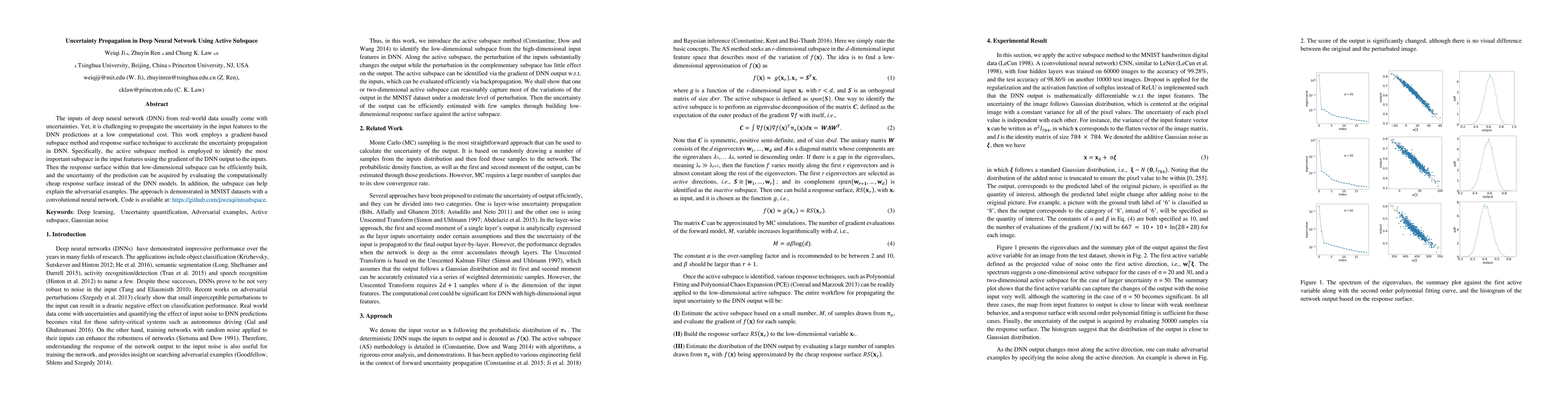 This paper proposes an efficient method for uncertainty propagation in deep neural networks (DNN) using active subspaces to identify critical input features, enabling low-cost uncertainty evaluation via a response surface model instead of direct DNN computations. The method is demonstrated on MNIST data with a convolutional neural network.