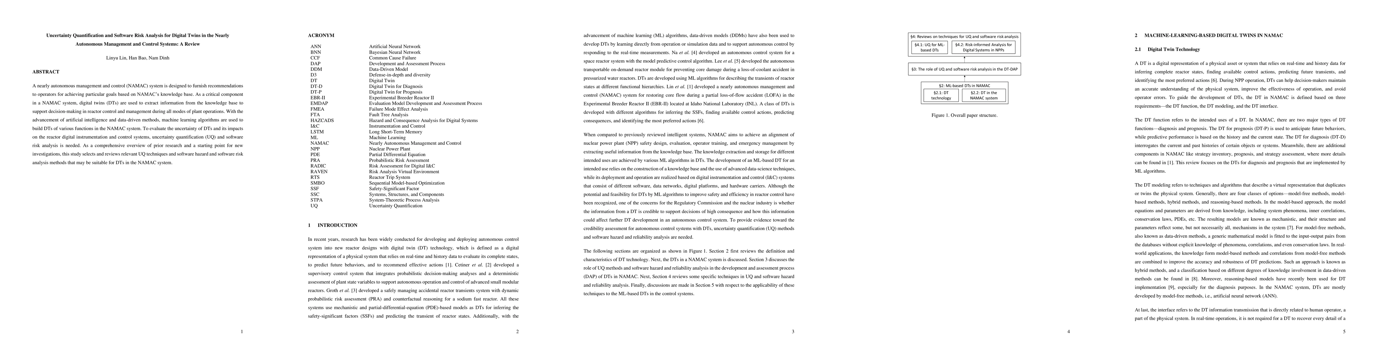 A nearly autonomous management and control (NAMAC) system is designed to furnish recommendations to operators for achieving particular goals based on NAMAC's knowledge base. As a critical component in a NAMAC system, digital twins (DTs) are used to extract information from the knowledge base to support decision-making in reactor control and management during all modes of plant operations. With the advancement of artificial intelligence and data-driven methods, machine learning algorithms are used to build DTs of various functions in the NAMAC system. To evaluate the uncertainty of DTs and its impacts on the reactor digital instrumentation and control systems, uncertainty quantification (UQ) and software risk analysis is needed. As a comprehensive overview of prior research and a starting point for new investigations, this study selects and reviews relevant UQ techniques and software hazard and software risk analysis methods that may be suitable for DTs in the NAMAC system.
