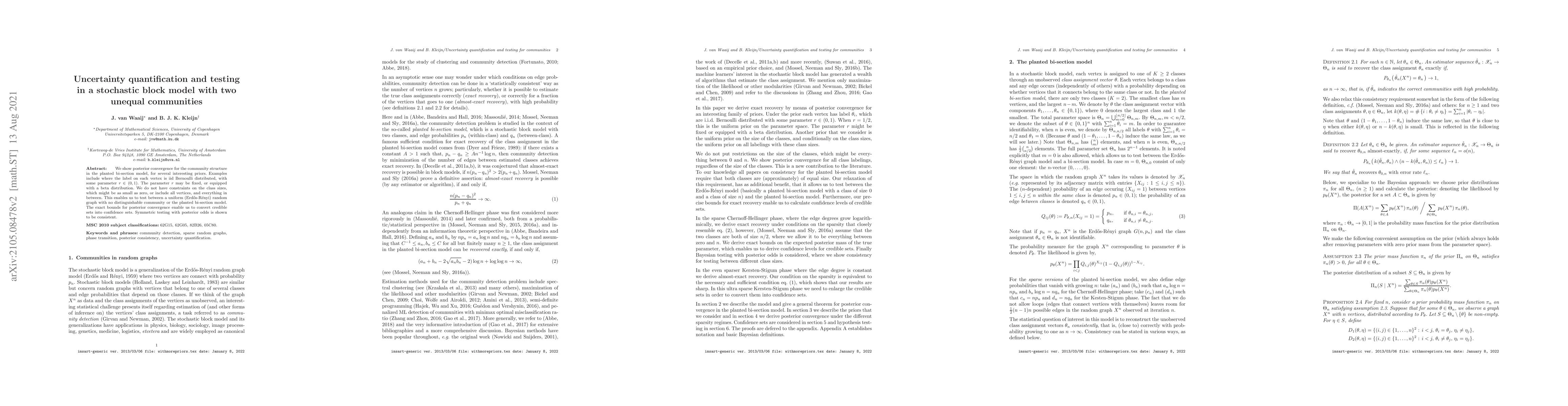 We show posterior convergence for the community structure in the planted bi-section model, for several interesting priors. Examples include where the label on each vertex is iid Bernoulli distributed, with some parameter $r\in(0,1)$. The parameter $r$ may be fixed, or equipped with a beta distribution. We do not have constraints on the class sizes, which might be as small as zero, or include all vertices, and everything in between. This enables us to test between a uniform (Erd\"os-R\'enyi) random graph with no distinguishable community or the planted bi-section model. The exact bounds for posterior convergence enable us to convert credible sets into confidence sets. Symmetric testing with posterior odds is shown to be consistent.