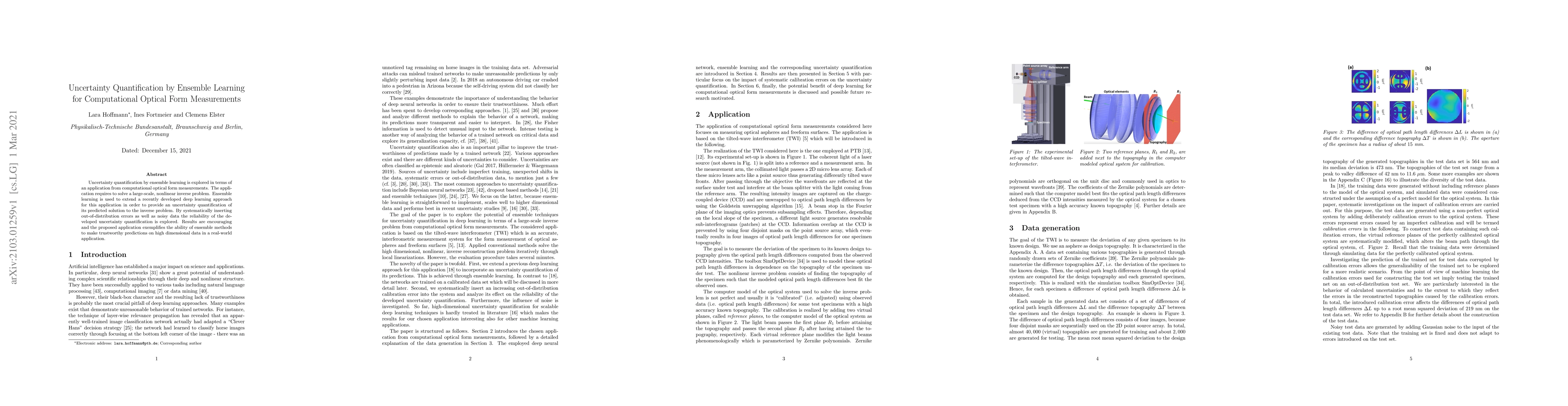 Uncertainty quantification by ensemble learning is explored in terms of an application from computational optical form measurements. The application requires to solve a large-scale, nonlinear inverse problem. Ensemble learning is used to extend a recently developed deep learning approach for this application in order to provide an uncertainty quantification of its predicted solution to the inverse problem. By systematically inserting out-of-distribution errors as well as noisy data the reliability of the developed uncertainty quantification is explored. Results are encouraging and the proposed application exemplifies the ability of ensemble methods to make trustworthy predictions on high dimensional data in a real-world application.