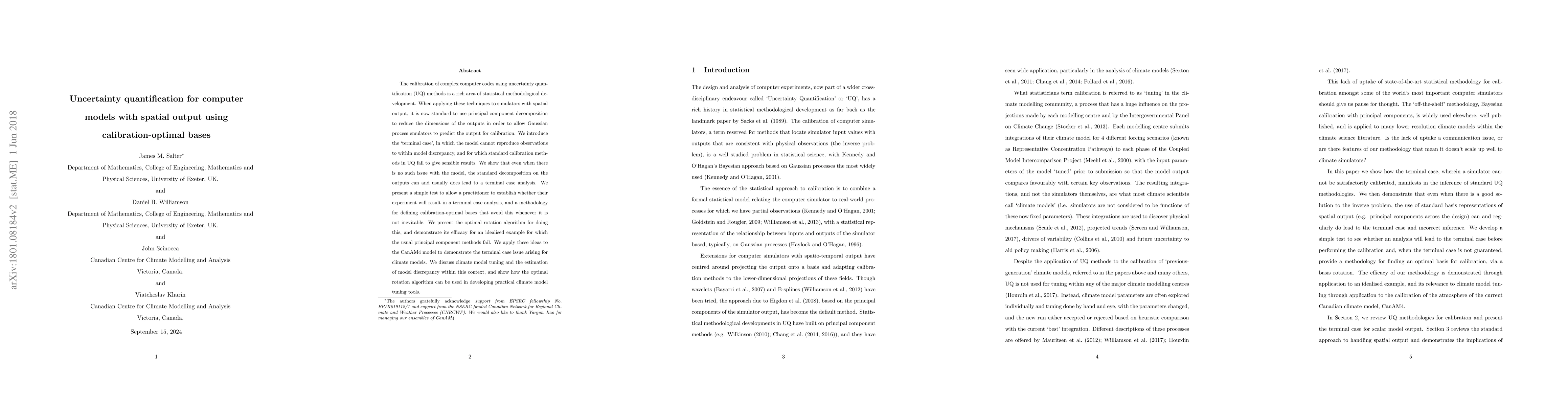 This paper introduces a methodology for uncertainty quantification in computer models with spatial output, focusing on calibration-optimal bases to avoid terminal case analysis. It proposes an optimal rotation algorithm to define calibration-optimal bases, demonstrating its effectiveness in practical applications like climate model tuning for the CanAM4 model.