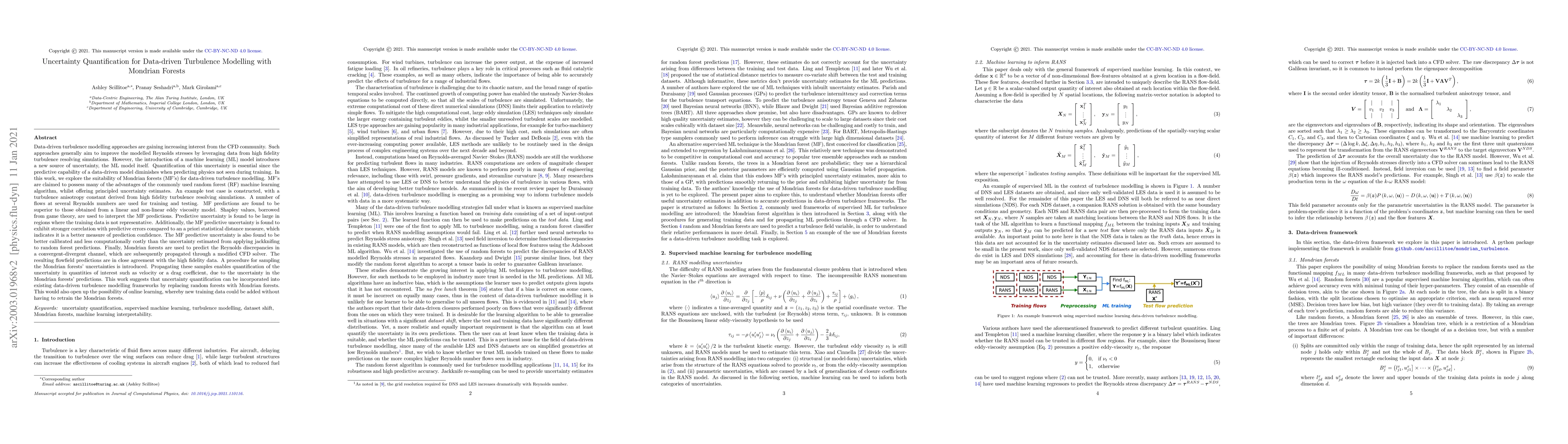 This paper investigates the use of Mondrian forests for data-driven turbulence modelling, highlighting their ability to provide principled uncertainty estimates compared to random forests. The study finds that Mondrian forests offer better calibration and lower computational costs for uncertainty quantification, ultimately leading to accurate predictions of flowfield quantities in a convergent-divergent channel.