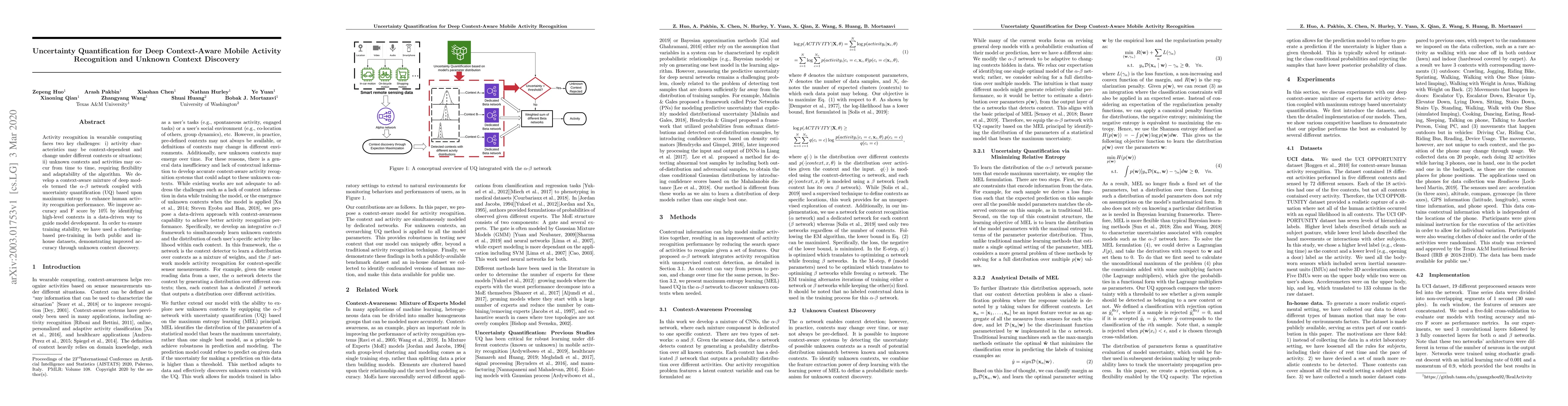 Activity recognition in wearable computing faces two key challenges: i) activity characteristics may be context-dependent and change under different contexts or situations; ii) unknown contexts and activities may occur from time to time, requiring flexibility and adaptability of the algorithm. We develop a context-aware mixture of deep models termed the {\alpha}-\b{eta} network coupled with uncertainty quantification (UQ) based upon maximum entropy to enhance human activity recognition performance. We improve accuracy and F score by 10% by identifying high-level contexts in a data-driven way to guide model development. In order to ensure training stability, we have used a clustering-based pre-training in both public and in-house datasets, demonstrating improved accuracy through unknown context discovery.