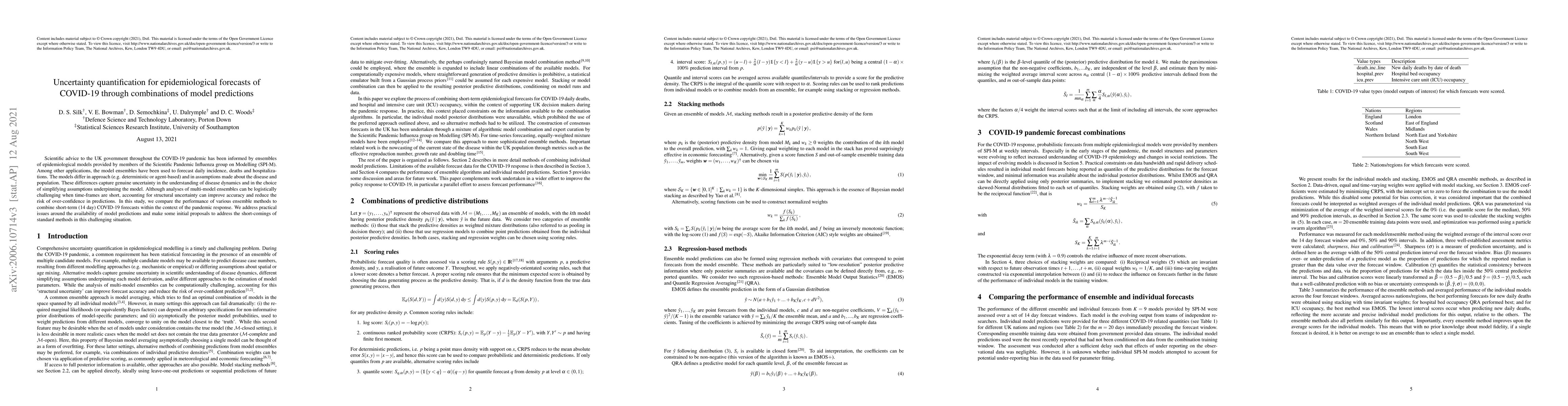 Scientific advice to the UK government throughout the COVID-19 pandemic has been informed by ensembles of epidemiological models provided by members of the Scientific Pandemic Influenza group on Modelling (SPI-M). Among other applications, the model ensembles have been used to forecast daily incidence, deaths and hospitalizations. The models differ in approach (e.g. deterministic or agent-based) and in assumptions made about the disease and population. These differences capture genuine uncertainty in the understanding of disease dynamics and in the choice of simplifying assumptions underpinning the model. Although analyses of multi-model ensembles can be logistically challenging when time-frames are short, accounting for structural uncertainty can improve accuracy and reduce the risk of over-confidence in predictions. In this study, we compare the performance of various ensemble methods to combine short-term (14 day) COVID-19 forecasts within the context of the pandemic response. We address practical issues around the availability of model predictions and make some initial proposals to address the short-comings of standard methods in this challenging situation.