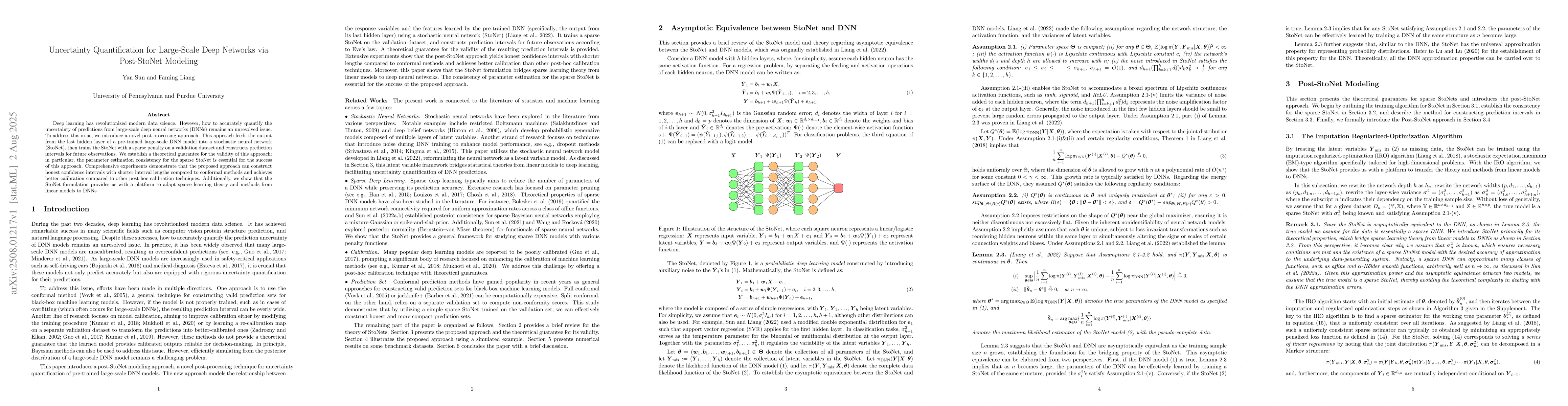 Deep learning has revolutionized modern data science. However, how to accurately quantify the uncertainty of predictions from large-scale deep neural networks (DNNs) remains an unresolved issue. To address this issue, we introduce a novel post-processing approach. This approach feeds the output from the last hidden layer of a pre-trained large-scale DNN model into a stochastic neural network (StoNet), then trains the StoNet with a sparse penalty on a validation dataset and constructs prediction intervals for future observations. We establish a theoretical guarantee for the validity of this approach; in particular, the parameter estimation consistency for the sparse StoNet is essential for the success of this approach. Comprehensive experiments demonstrate that the proposed approach can construct honest confidence intervals with shorter interval lengths compared to conformal methods and achieves better calibration compared to other post-hoc calibration techniques. Additionally, we show that the StoNet formulation provides us with a platform to adapt sparse learning theory and methods from linear models to DNNs.