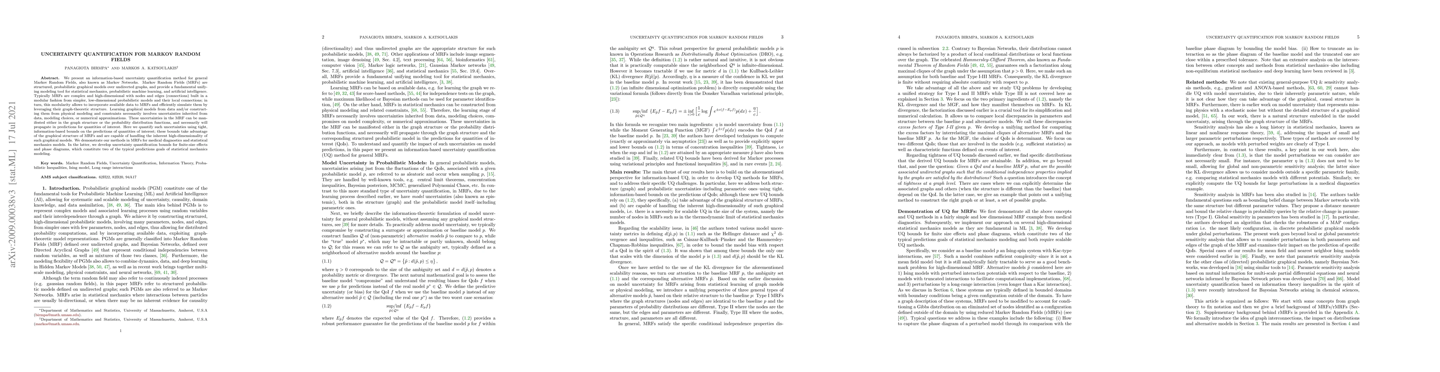 This paper introduces an information-based method for quantifying uncertainties in Markov Random Fields (MRFs), leveraging their graph structure to provide tight bounds on predictions. The approach is demonstrated in applications for medical diagnostics and statistical mechanics, including finite size effects and phase diagrams.