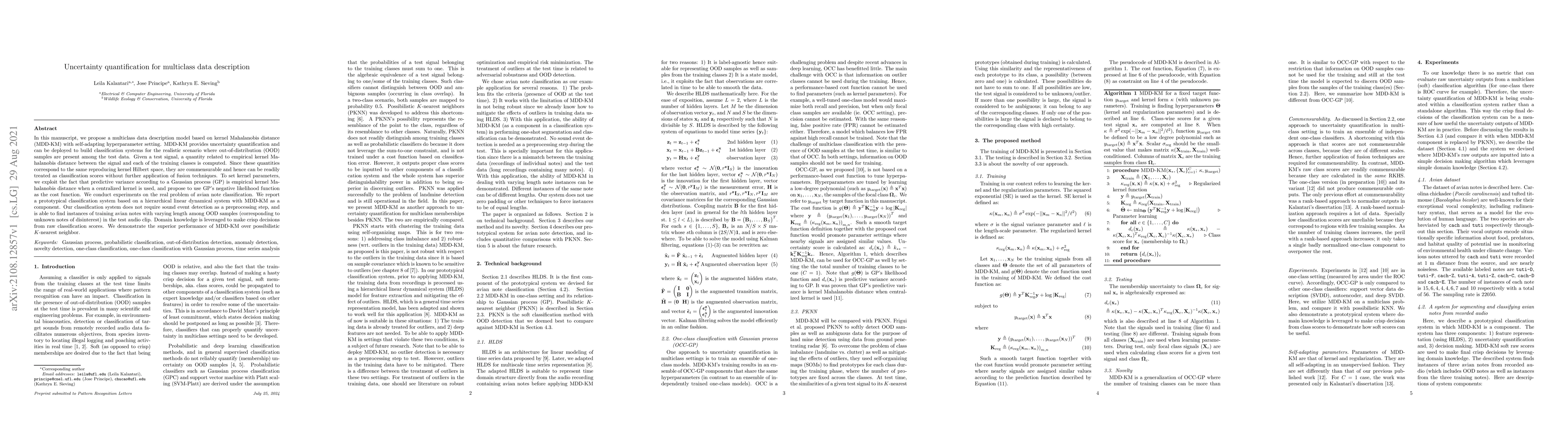 In this manuscript, we propose a multiclass data description model based on kernel Mahalanobis distance (MDD-KM) with self-adapting hyperparameter setting. MDD-KM provides uncertainty quantification and can be deployed to build classification systems for the realistic scenario where out-of-distribution (OOD) samples are present among the test data. Given a test signal, a quantity related to empirical kernel Mahalanobis distance between the signal and each of the training classes is computed. Since these quantities correspond to the same reproducing kernel Hilbert space, they are commensurable and hence can be readily treated as classification scores without further application of fusion techniques. To set kernel parameters, we exploit the fact that predictive variance according to a Gaussian process (GP) is empirical kernel Mahalanobis distance when a centralized kernel is used, and propose to use GP's negative likelihood function as the cost function. We conduct experiments on the real problem of avian note classification. We report a prototypical classification system based on a hierarchical linear dynamical system with MDD-KM as a component. Our classification system does not require sound event detection as a preprocessing step, and is able to find instances of training avian notes with varying length among OOD samples (corresponding to unknown notes of disinterest) in the test audio clip. Domain knowledge is leveraged to make crisp decisions from raw classification scores. We demonstrate the superior performance of MDD-KM over possibilistic K-nearest neighbor.