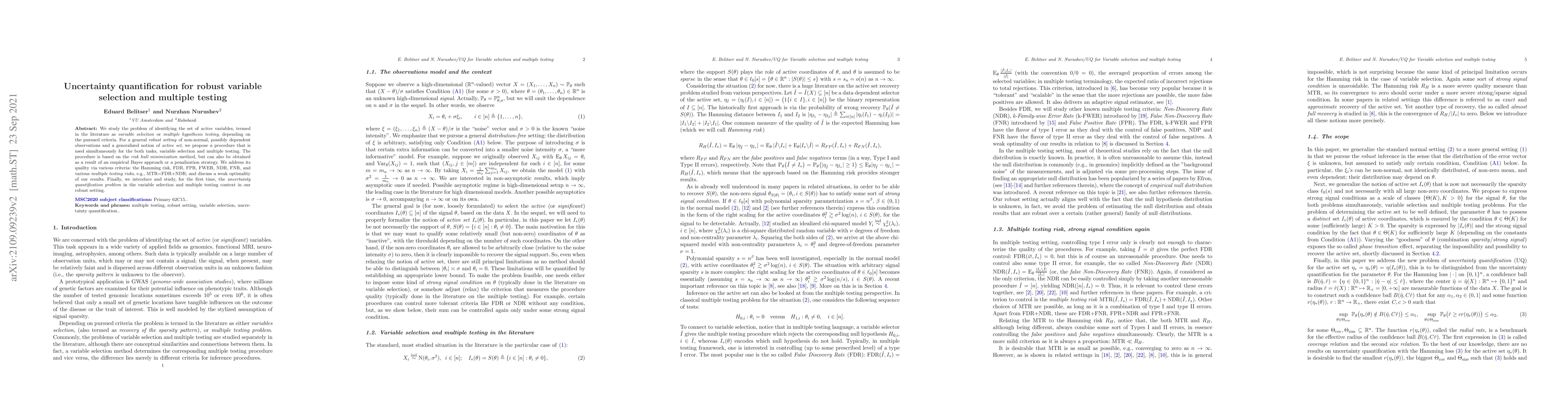 We study the problem of identifying the set of \emph{active} variables, termed in the literature as \emph{variable selection} or \emph{multiple hypothesis testing}, depending on the pursued criteria. For a general \emph{robust setting} of non-normal, possibly dependent observations and a generalized notion of \emph{active set}, we propose a procedure that is used simultaneously for the both tasks, variable selection and multiple testing. The procedure is based on the \emph{risk hull minimization} method, but can also be obtained as a result of an empirical Bayes approach or a penalization strategy. We address its quality via various criteria: the Hamming risk, FDR, FPR, FWER, NDR, FNR,and various \emph{multiple testing risks}, e.g., MTR=FDR+NDR; and discuss a weak optimality of our results. Finally, we introduce and study, for the first time, the \emph{uncertainty quantification problem} in the variable selection and multiple testing context in our robust setting.