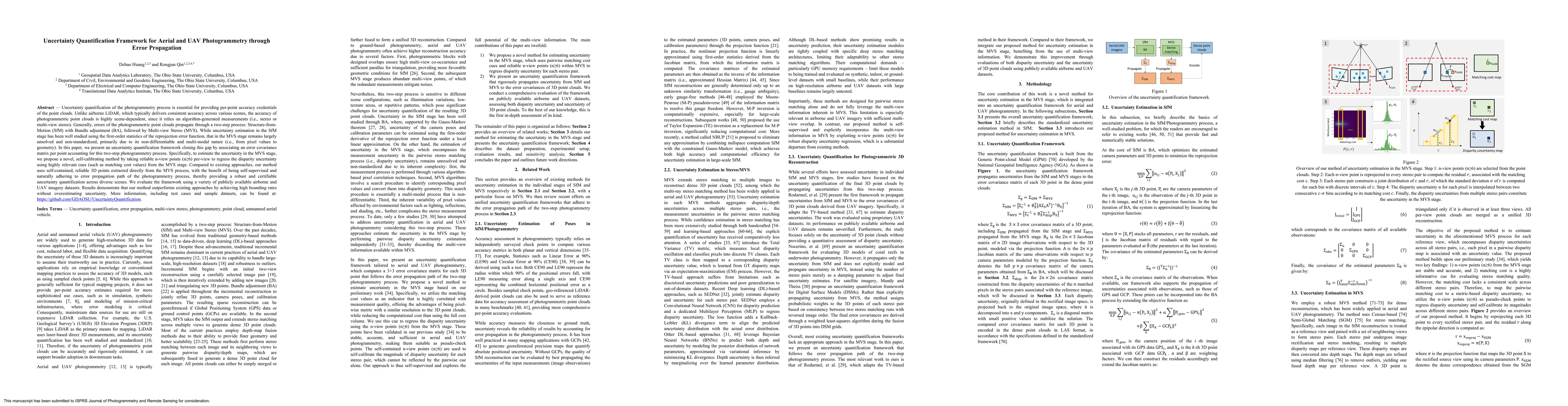 Uncertainty quantification of the photogrammetry process is essential for providing per-point accuracy credentials of the point clouds. Unlike airborne LiDAR, which typically delivers consistent accuracy across various scenes, the accuracy of photogrammetric point clouds is highly scene-dependent, since it relies on algorithm-generated measurements (i.e., stereo or multi-view stereo). Generally, errors of the photogrammetric point clouds propagate through a two-step process: Structure-from-Motion (SfM) with Bundle adjustment (BA), followed by Multi-view Stereo (MVS). While uncertainty estimation in the SfM stage has been well studied using the first-order statistics of the reprojection error function, that in the MVS stage remains largely unsolved and non-standardized, primarily due to its non-differentiable and multi-modal nature (i.e., from pixel values to geometry). In this paper, we present an uncertainty quantification framework closing this gap by associating an error covariance matrix per point accounting for this two-step photogrammetry process. Specifically, to estimate the uncertainty in the MVS stage, we propose a novel, self-calibrating method by taking reliable n-view points (n>=6) per-view to regress the disparity uncertainty using highly relevant cues (such as matching cost values) from the MVS stage. Compared to existing approaches, our method uses self-contained, reliable 3D points extracted directly from the MVS process, with the benefit of being self-supervised and naturally adhering to error propagation path of the photogrammetry process, thereby providing a robust and certifiable uncertainty quantification across diverse scenes. We evaluate the framework using a variety of publicly available airborne and UAV imagery datasets. Results demonstrate that our method outperforms existing approaches by achieving high bounding rates without overestimating uncertainty.