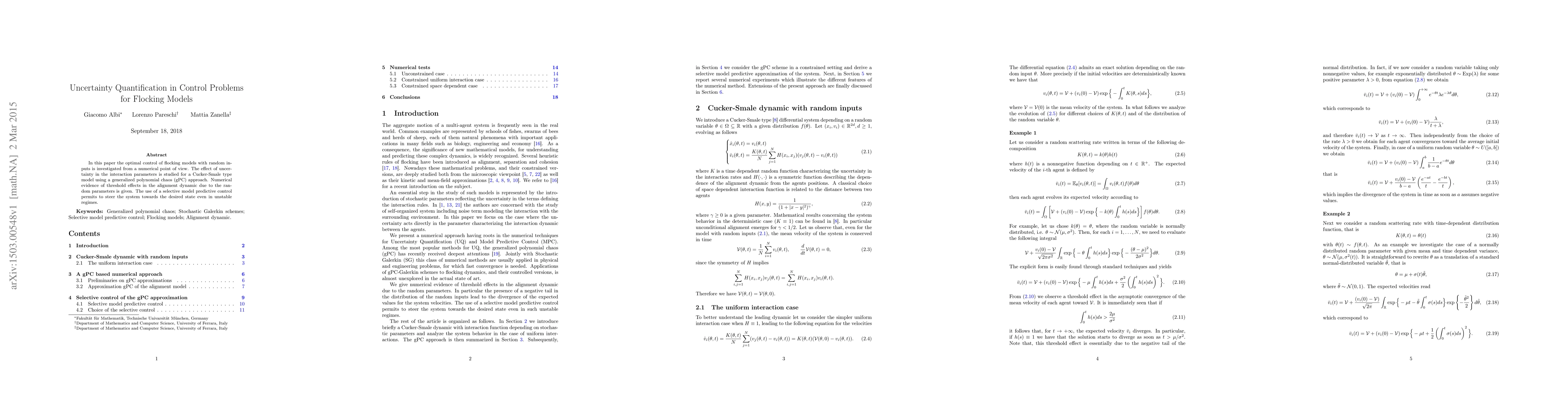 In this paper the optimal control of flocking models with random inputs is investigated from a numerical point of view. The effect of uncertainty in the interaction parameters is studied for a Cucker-Smale type model using a generalized polynomial chaos (gPC) approach. Numerical evidence of threshold effects in the alignment dynamic due to the random parameters is given. The use of a selective model predictive control permits to steer the system towards the desired state even in unstable regimes.