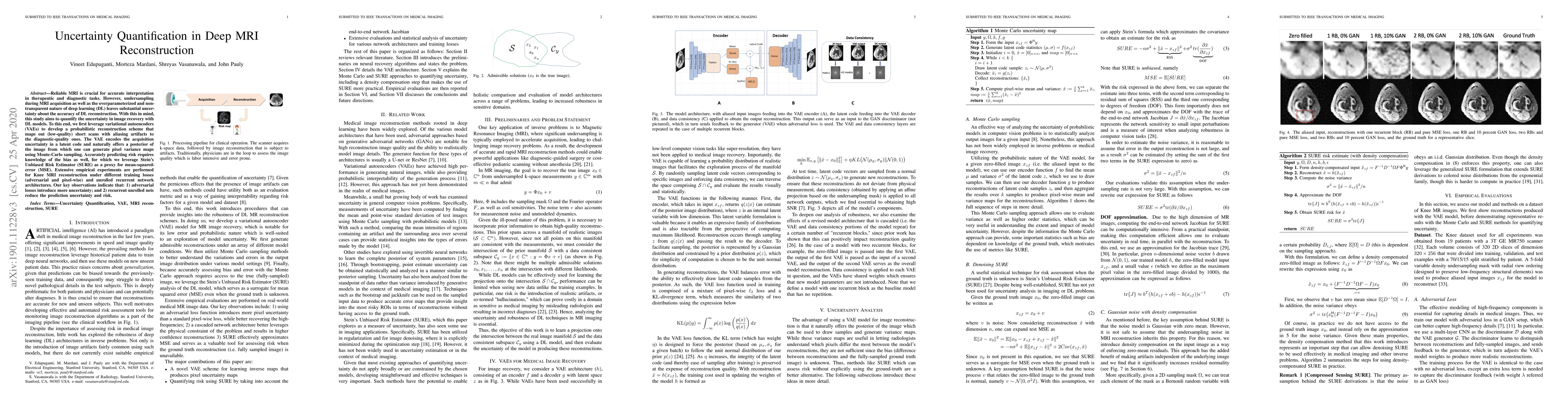 This study aims to quantify uncertainty in deep learning-based MRI reconstruction, leveraging variational autoencoders and Monte-Carlo sampling to generate pixel variance maps. Experiments show that adversarial losses increase uncertainty, while recurrent unrolled networks reduce it and improve risk prediction.