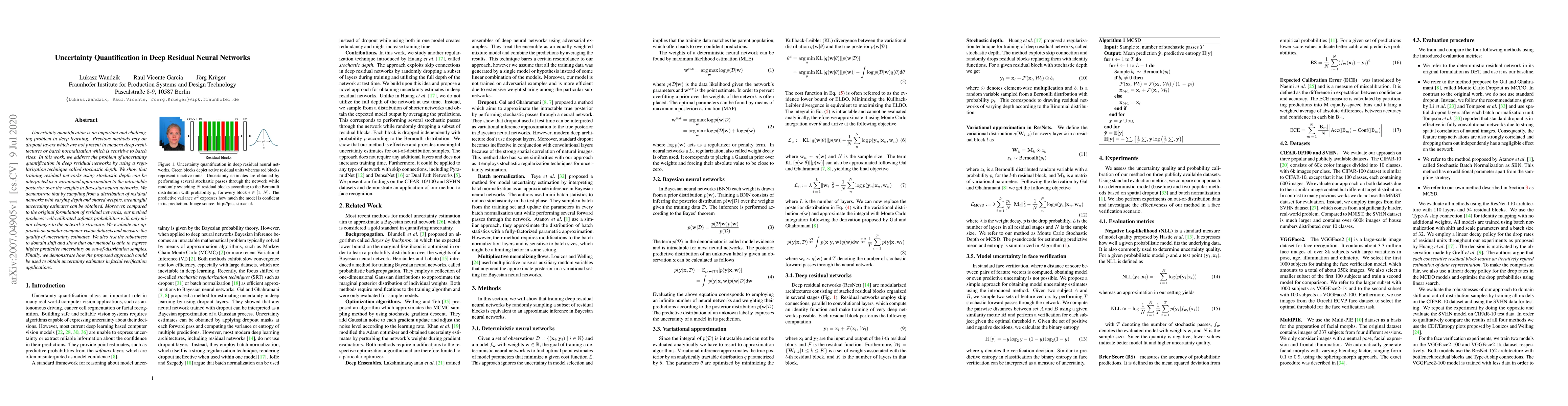 This paper proposes a method for uncertainty quantification in deep residual networks using stochastic depth, which provides a variational approximation to Bayesian neural networks. The approach yields well-calibrated softmax probabilities and higher predictive uncertainty on out-of-distribution samples, demonstrating robustness and applicability in facial verification.