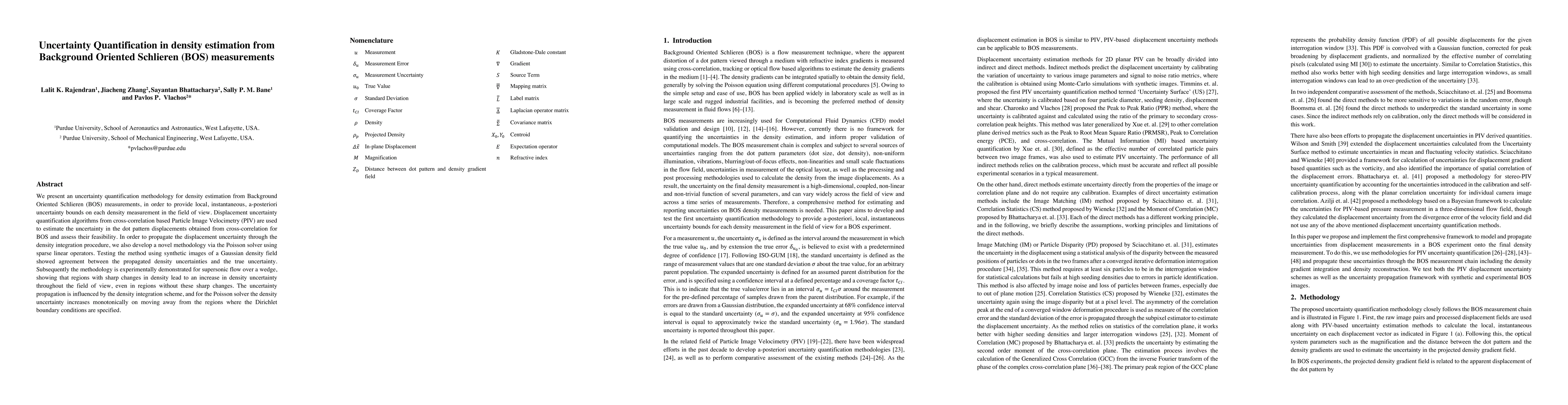 This paper presents a methodology for quantifying uncertainty in density estimation from Background Oriented Schlieren (BOS) measurements, using cross-correlation PIV displacement uncertainty algorithms and a novel Poisson solver approach. Experimental results demonstrate increased uncertainty in regions with sharp density changes, highlighting the influence of the density integration scheme.