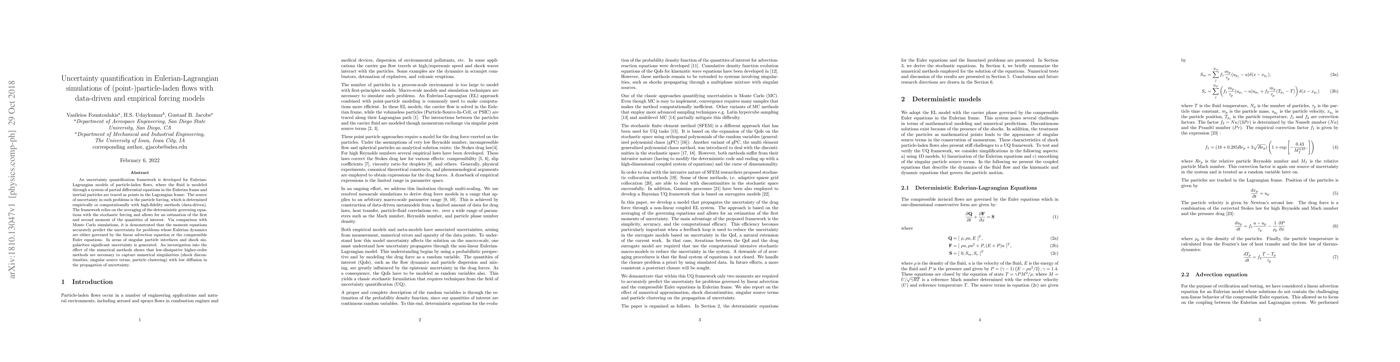 This paper develops a framework for uncertainty quantification in Eulerian-Lagrangian simulations of particle-laden flows, focusing on the stochastic nature of particle forcing. It demonstrates the framework's accuracy via comparison with Monte Carlo simulations and highlights the necessity of low-dissipative methods to capture uncertainties near singularities.