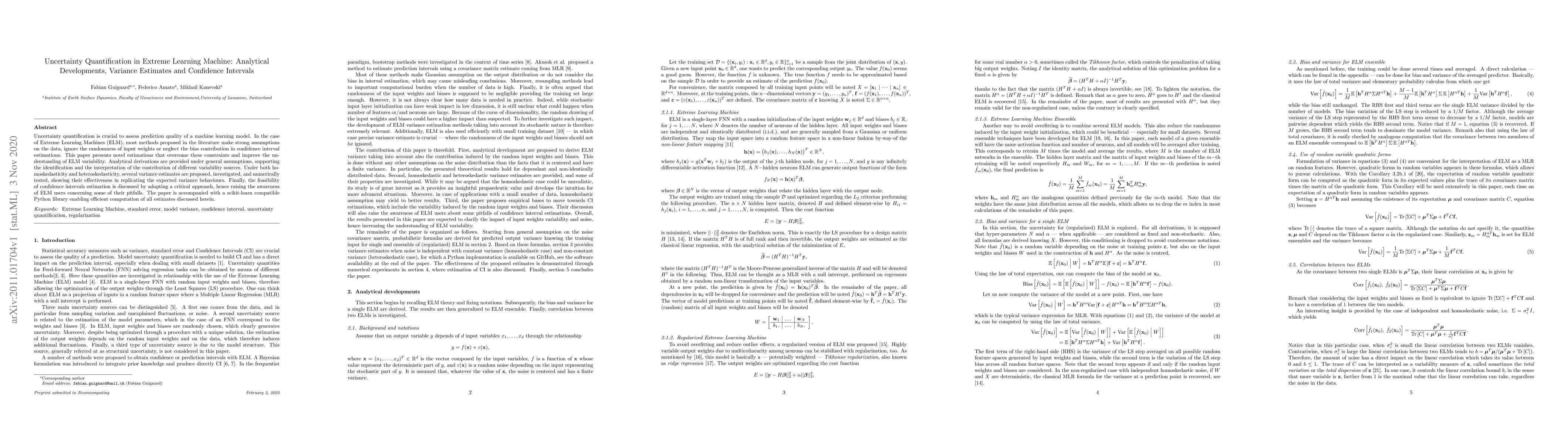 This paper presents novel estimations for uncertainty quantification in Extreme Learning Machines (ELM), improving understanding of ELM variability and providing confidence interval estimations without strong assumptions on data.