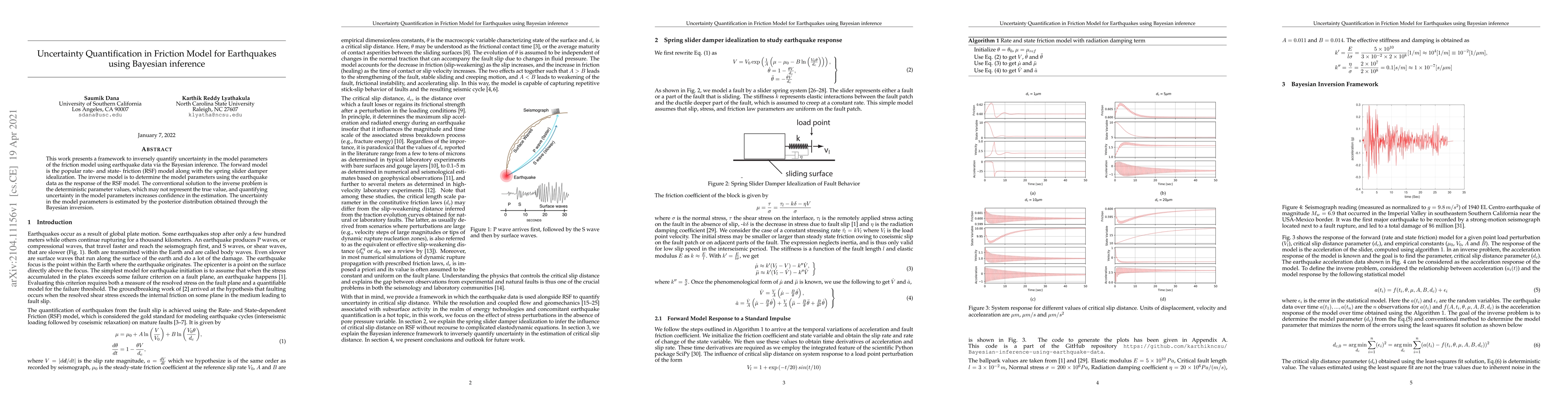 This work presents a framework to inversely quantify uncertainty in the model parameters of the friction model using earthquake data via the Bayesian inference. The forward model is the popular rate- and state- friction (RSF) model along with the spring slider damper idealization. The inverse model is to determine the model parameters using the earthquake data as the response of the RSF model. The conventional solution to the inverse problem is the deterministic parameter values, which may not represent the true value, and quantifying uncertainty in the model parameters increases confidence in the estimation. The uncertainty in the model parameters is estimated by the posterior distribution obtained through the Bayesian inversion.