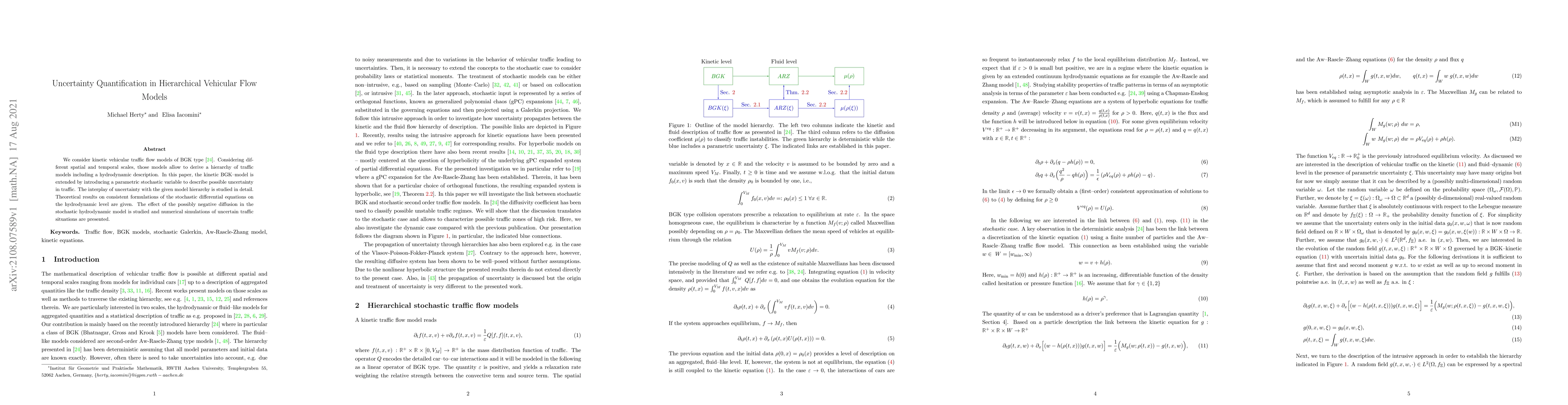 We consider kinetic vehicular traffic flow models of BGK type. Considering different spatial and temporal scales, those models allow to derive a hierarchy of traffic models including a hydrodynamic description. In this paper, the kinetic BGK-model is extended by introducing a parametric stochastic variable to describe possible uncertainty in traffic. The interplay of uncertainty with the given model hierarchy is studied in detail. Theoretical results on consistent formulations of the stochastic differential equations on the hydrodynamic level are given. The effect of the possibly negative diffusion in the stochastic hydrodynamic model is studied and numerical simulations of uncertain traffic situations are presented.