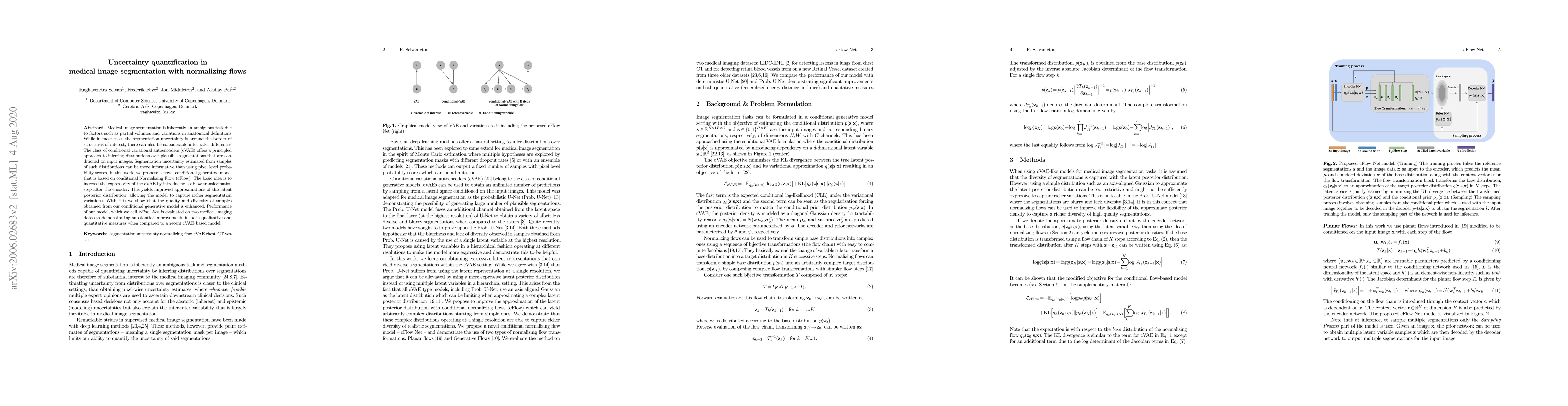 This paper proposes a novel conditional Normalizing Flow (cFlow) model, called cFlow Net, to enhance medical image segmentation by capturing richer segmentation variations and improving uncertainty quantification compared to conditional variational autoencoders (cVAE). The cFlow Net model shows substantial improvements in both qualitative and quantitative measures on two medical imaging datasets.