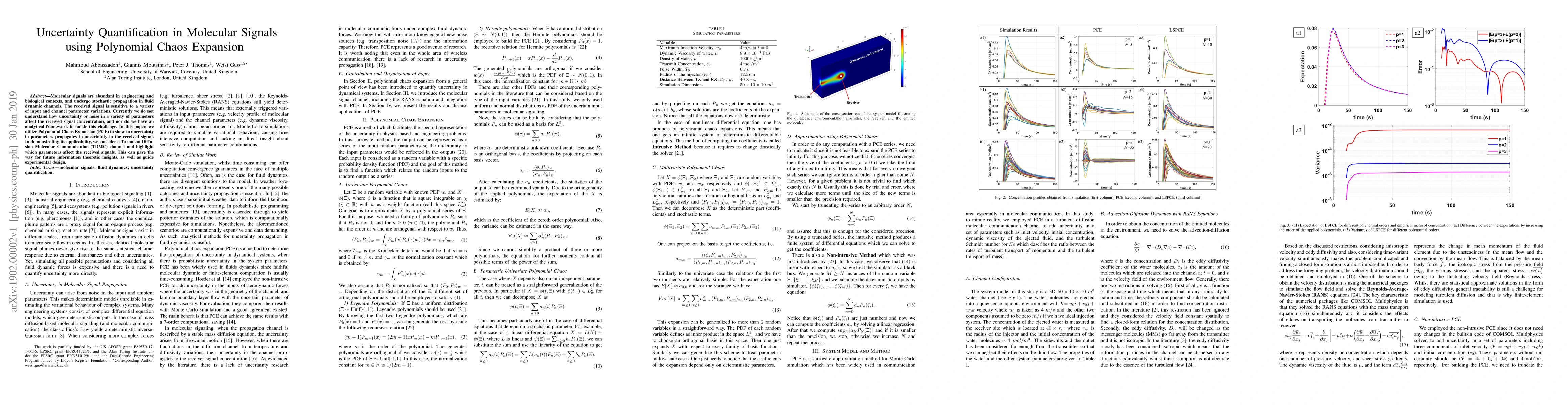 This paper uses Polynomial Chaos Expansion (PCE) to quantify uncertainty in molecular signals propagated through fluid dynamic channels, focusing on the Turbulent Diffusion Molecular Communication (TDMC) channel. It identifies how parameter variations affect the received signal concentration, providing a framework for future information theory and experimental design.