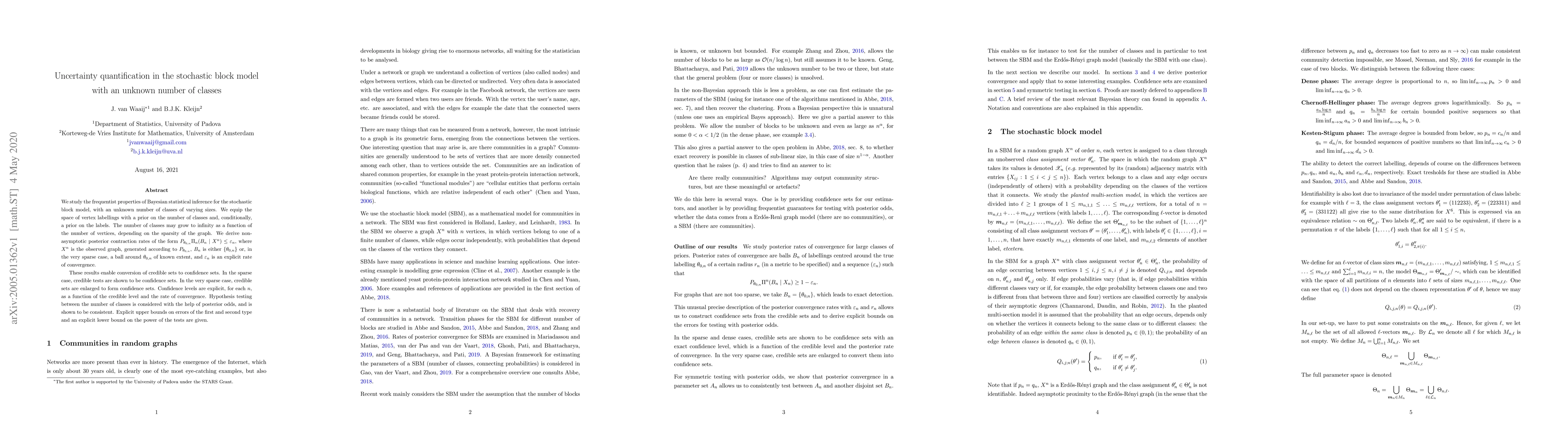 We study the frequentist properties of Bayesian statistical inference for the stochastic block model, with an unknown number of classes of varying sizes. We equip the space of vertex labellings with a prior on the number of classes and, conditionally, a prior on the labels. The number of classes may grow to infinity as a function of the number of vertices, depending on the sparsity of the graph. We derive non-asymptotic posterior contraction rates of the form $P_{\theta_{0,n}}\Pi_n(B_n\mid X^n)\le \epsilon_n$, where $X^n$ is the observed graph, generated according to $P_{\theta_{0,n}}$, $B_n$ is either $\{\theta_{0, n}\}$ or, in the very sparse case, a ball around $\theta_{0,n}$ of known extent, and $\epsilon_n$ is an explicit rate of convergence. These results enable conversion of credible sets to confidence sets. In the sparse case, credible tests are shown to be confidence sets. In the very sparse case, credible sets are enlarged to form confidence sets. Confidence levels are explicit, for each $n$, as a function of the credible level and the rate of convergence. Hypothesis testing between the number of classes is considered with the help of posterior odds, and is shown to be consistent. Explicit upper bounds on errors of the first and second type and an explicit lower bound on the power of the tests are given.