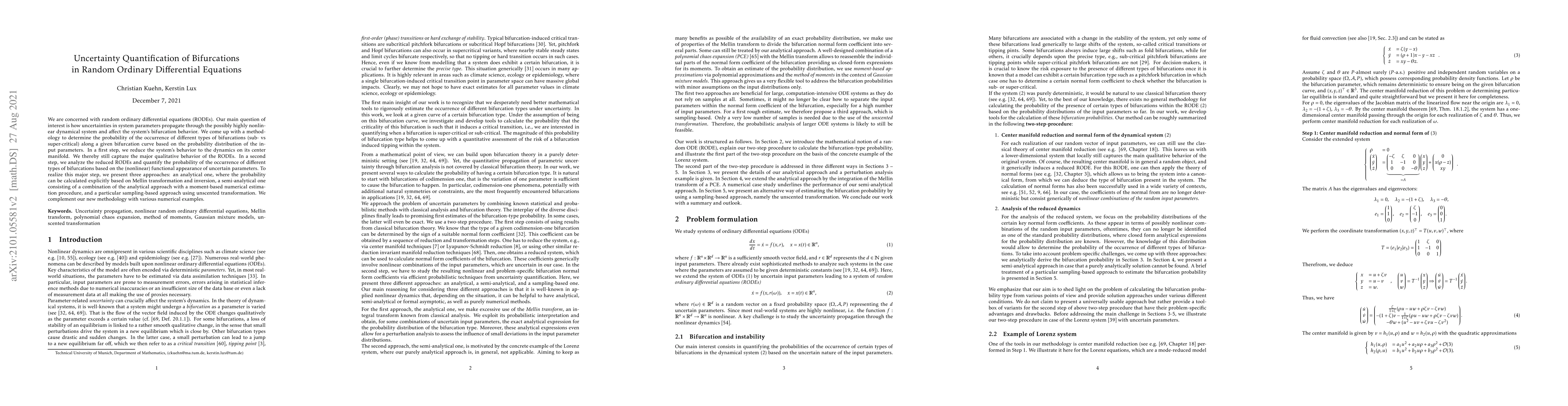 We are concerned with random ordinary differential equations (RODEs). Our main question of interest is how uncertainties in system parameters propagate through the possibly highly nonlinear dynamical system and affect the system's bifurcation behavior. We come up with a methodology to determine the probability of the occurrence of different types of bifurcations (sub- vs super-critical) along a given bifurcation curve based on the probability distribution of the input parameters. In a first step, we reduce the system's behavior to the dynamics on its center manifold. We thereby still capture the major qualitative behavior of the RODEs. In a second step, we analyze the reduced RODEs and quantify the probability of the occurrence of different types of bifurcations based on the (nonlinear) functional appearance of uncertain parameters. To realize this major step, we present three approaches: an analytical one, where the probability can be calculated explicitly based on Mellin transformation and inversion, a semi-analytical one consisting of a combination of the analytical approach with a moment-based numerical estimation procedure, and a particular sampling-based approach using unscented transformation. We complement our new methodology with various numerical examples.