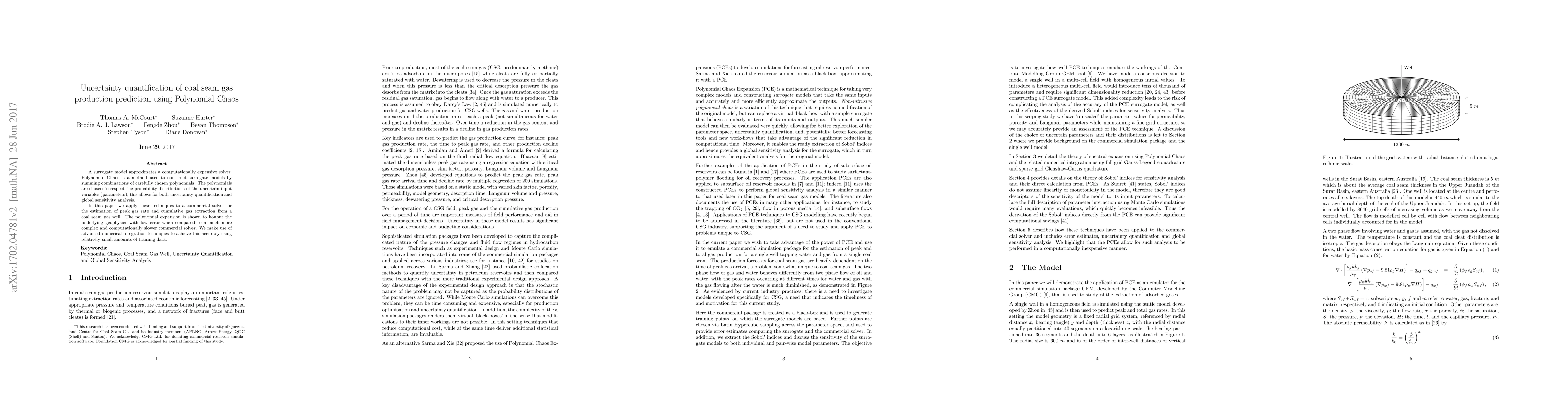 This paper applies Polynomial Chaos to construct a surrogate model for predicting coal seam gas production, achieving low error compared to a complex commercial solver while enabling uncertainty quantification and global sensitivity analysis. Advanced numerical integration techniques allow for accurate results using minimal training data.