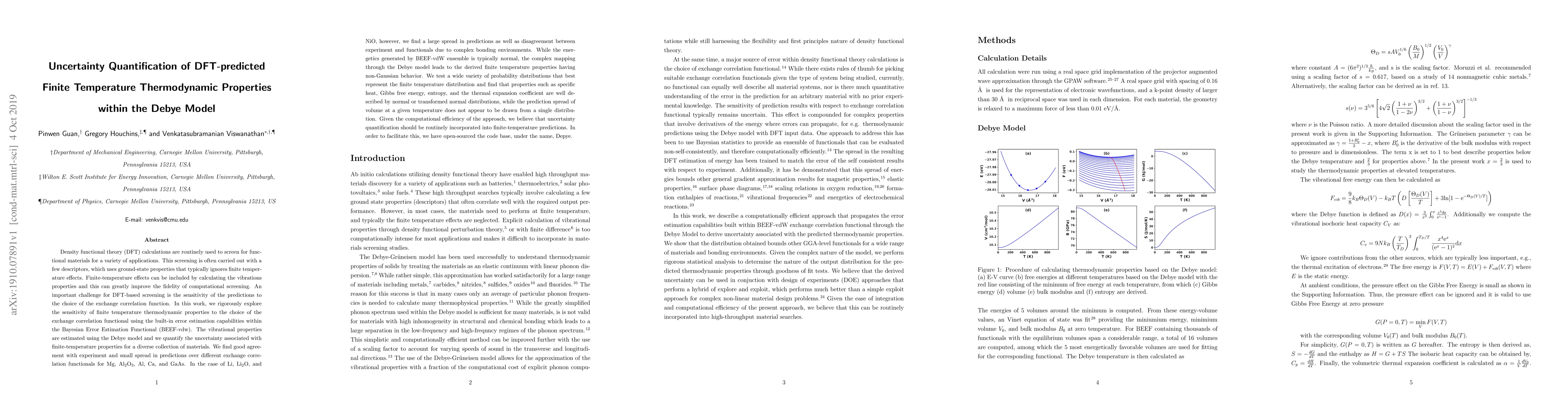Finite-temperature effects can be included by calculating the vibrations properties and this can greatly improve the fidelity of computational screening. An important challenge for DFT-based screening is the sensitivity of the predictions to the choice of the exchange correlation function. In this work, we rigorously explore the sensitivity of finite temperature thermodynamic properties to the choice of the exchange correlation functional using the built-in error estimation capabilities within the Bayesian Error Estimation Functional. The vibrational properties are estimated using the Debye model and we quantify the uncertainty associated with finite-temperature properties for a diverse collection of materials. We find good agreement with experiment and small spread in predictions over different exchange correlation functionals for Mg, Al$_2$O$_3$, Al, Ca, and GaAs. In the case of Li, Li$_2$O, and NiO, however, we find a large spread in predictions as well as disagreement between experiment and functionals due to complex bonding environments. While the energetics generated by BEEF-vdW ensemble is typically normal, the complex mapping through the Debye model leads to the derived finite temperature properties having non-Gaussian behavior. We test a wide variety of probability distributions that best represent the finite temperature distribution and find that properties such as specific heat, Gibbs free energy, entropy, and the thermal expansion coefficient are well described by normal or transformed normal distributions, while the prediction spread of volume at a given temperature does not appear to be drawn from a single distribution.